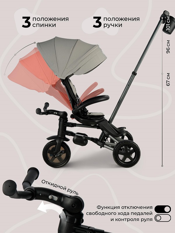 Регулируемая спинка и поворотное сидение позволит использовать велосипед для самых маленьких как летнюю "коляску". Велосипед растет вместе с ребенком, превращаясь в более легкую модель для самостоятельного катания ребенка.