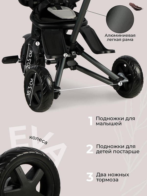 Удобное управление с помощью родительской ручки и практичные EVA, которые не прокалываются и подарят комфортные и удобные прогулки в теплое время года.