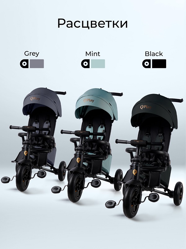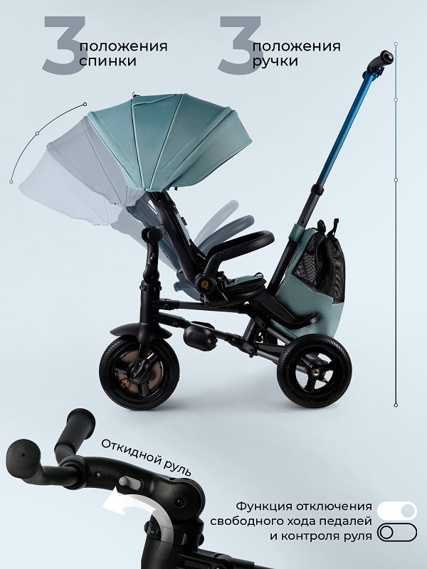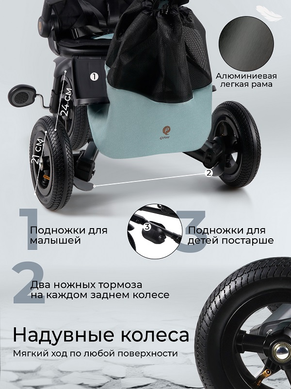 Для безопасности ребенка предусмотрены 5-ти точечные ремни безопасности и съемный, откидной бампер из эко кожи. Так же для удобства малыша предусмотрено два вида подножек, которые позволят комфортно разместиться малышу в велосипеде.