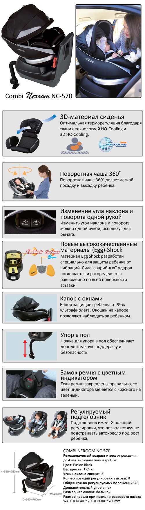 Для своего ребенка родители хотят только лучшего и к выбору детских товаров подходят с особой тщательностью. Не последнюю роль в выборе детского автокресла играет имя производителя, которое само по себе является определенным гарантом качества. Японская компания Combi на рынке детских товаров более пятидесяти лет, ее можно назвать одним из самых опытных и надежных производителей. Продукция этого бренда обладает традиционно высоким японским качеством, отличается инновационностью и высочайшим комфортом в использовании. Автокресло Neroom NC-570 Fusion Black предназначено для самых маленьких пассажиров, от рождения до 4 лет (18 кг). Эта модель действительно инновационная, поскольку, в отличие от других моделей, положение спинки регулируется не только по ходу движения, но и когда кресло установлено против хода (для детей от рождения до года).