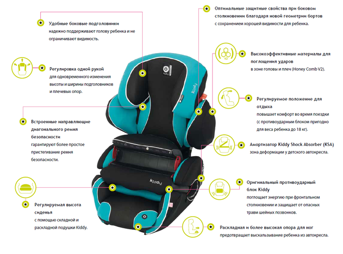 Корпус автокресла формован из особого материала (ЕРР), способного поглощать энергию удара, оставаясь при этом, ударопрочным. Голова ребенка надежно защищена боковыми бортами и подголовниками, которые не лишают его обзора. Противоударный блок Kiddy, расположенный в нижней части автокресла, защищает от фронтальных ударов. Еще одним важным элементом данной модели является запатентованный амортизатор – Kiddy Shock Absorber, находящийся в средней зоне, которая при ударе подвергается деформации.