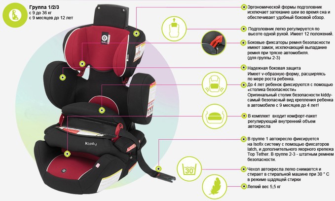Kiddy World Plus USA - кресло всех групп (от года до 12), созданное для американского рынка. Конечно, нашими соотечественниками оно используется также очень активно. Модель имеет большой внутренний объем и рассчитана на детей до50 кг. Объём можно уменьшить, если малыш совсем мал, достаточно использовать специальную вставку - пакет. Кресло имеет интересный способ крепления: фиксация состоит из аккуратных фиксаторов latch, которые прикреплены к автомобильным скобам изофикс, дополнительного красивого крепежа TopTether и внутреннего собственного ремня безопасности. Если в автомобиле нет креплений Isofix, кресло закрепляется обычным штатным ремнем в случае, если его длина минимум240 см. Ребенок фиксируется в кресле с помощью столика безопасности, поверх которого идет ремень фиксаторов latch или автомобильный ремень. В первом случае длина ремня значения не имеет, поскольку он не применяется.