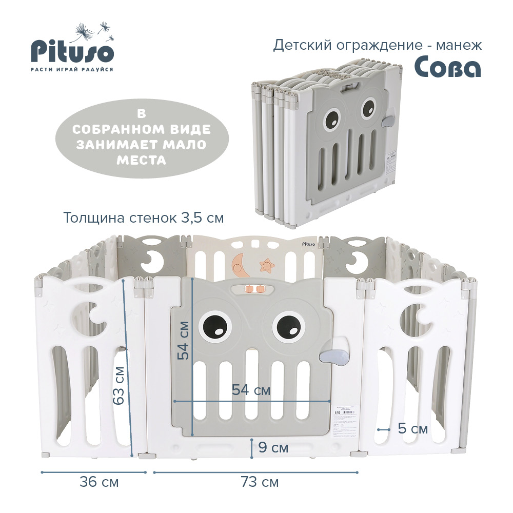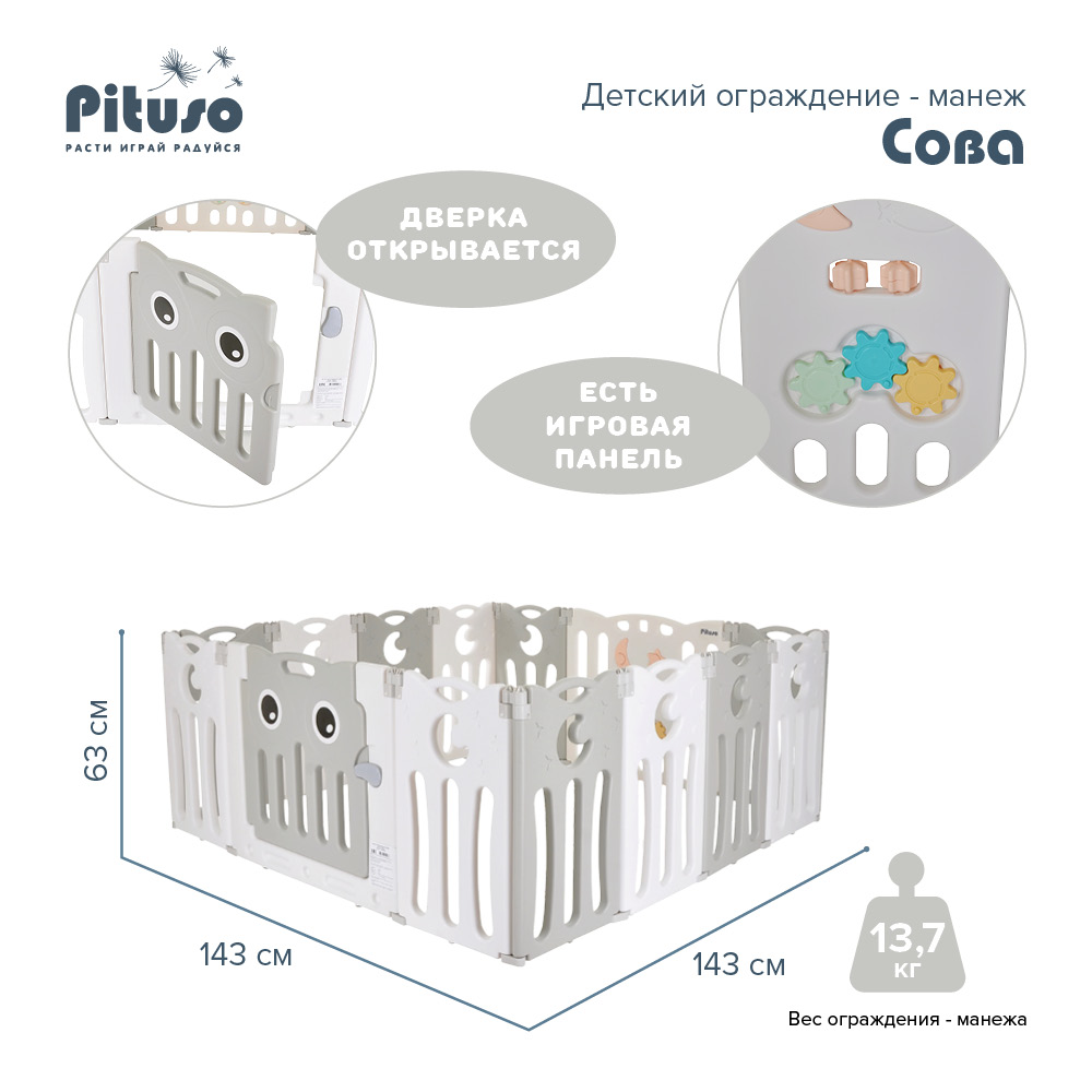 Детское ограждение-манеж Pituso Сова - предназначен для детских игр начиная с ясельного возраста, когда вашему ребенку нужен манеж-ограждение, заканчивая возрастом 6-7 лет, когда манеж послужит игровой зоной.