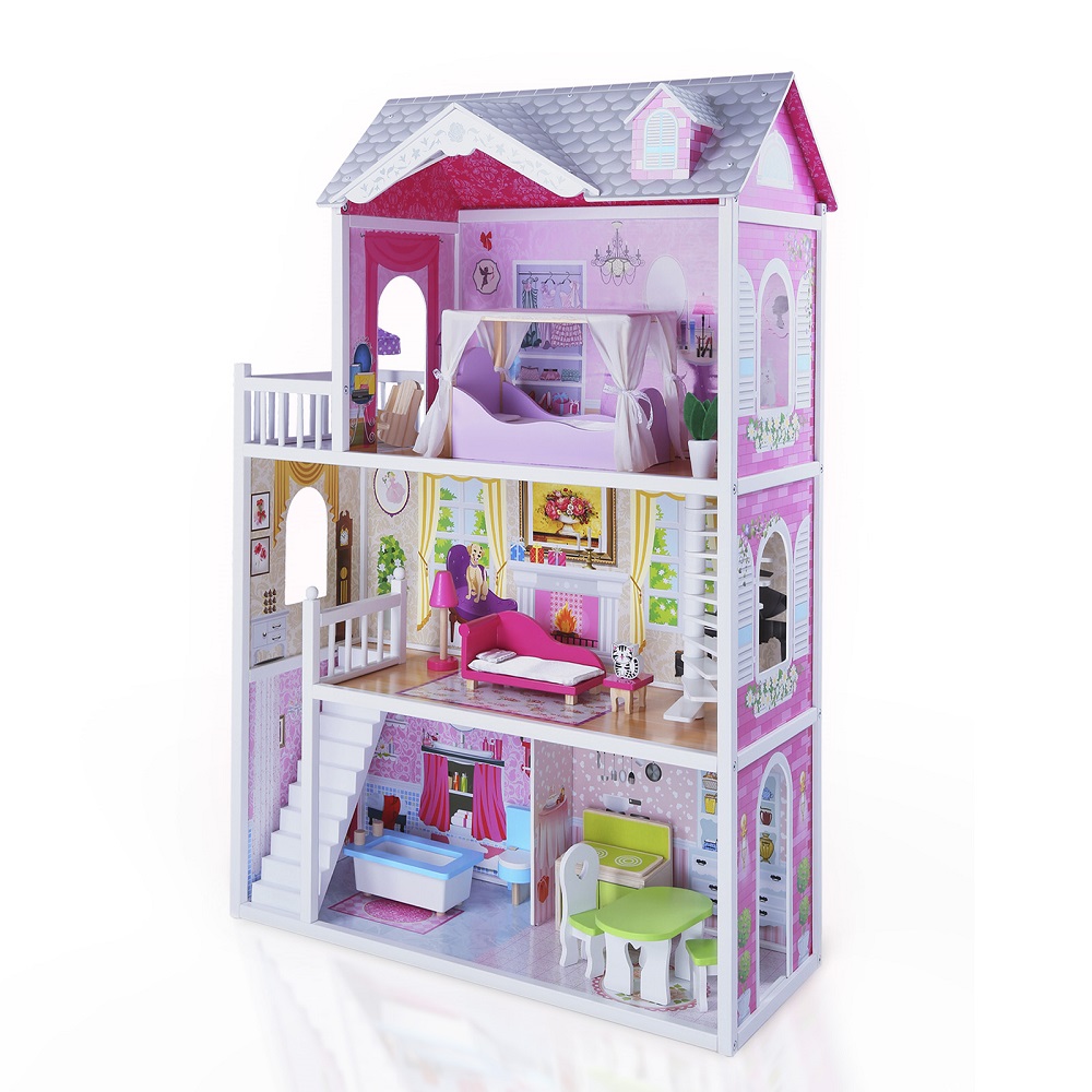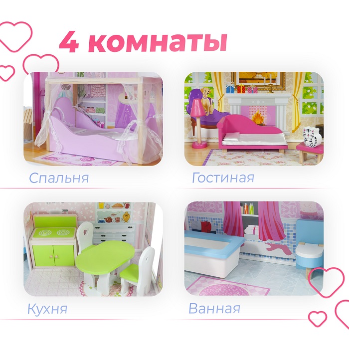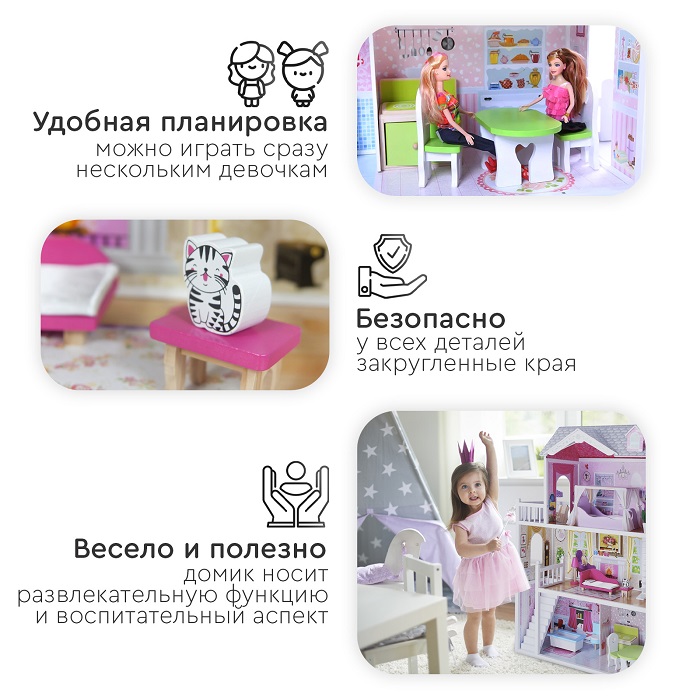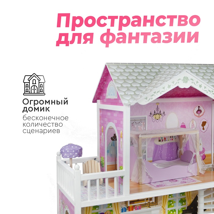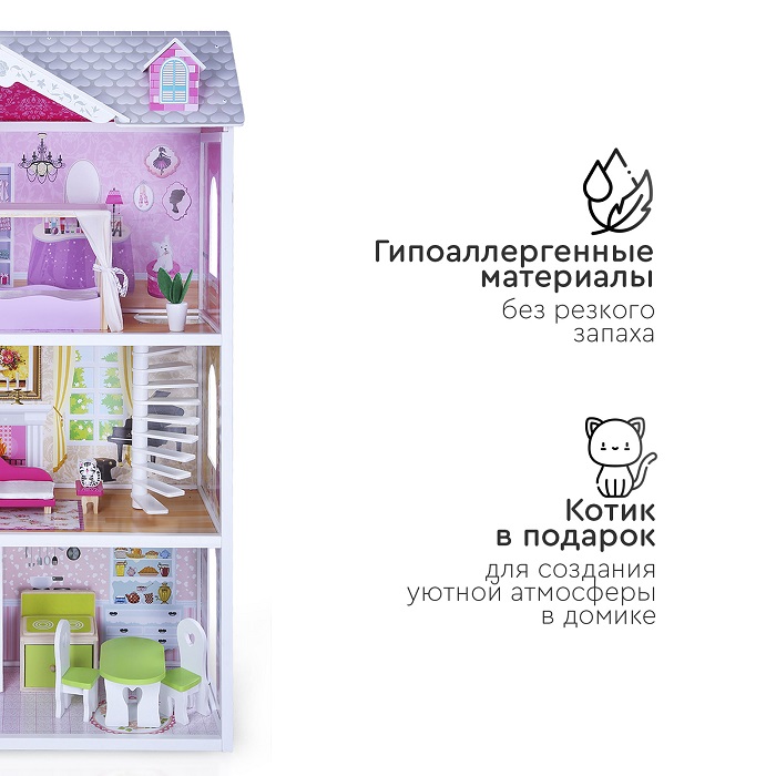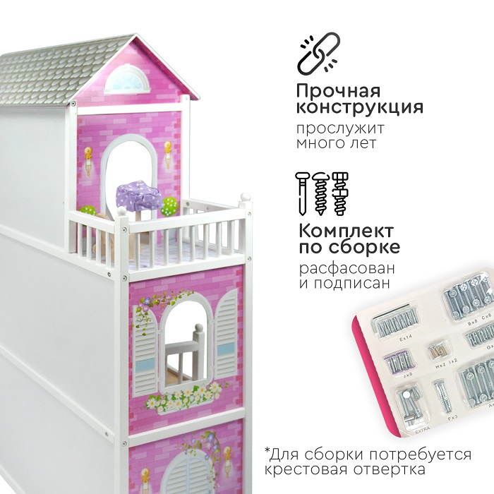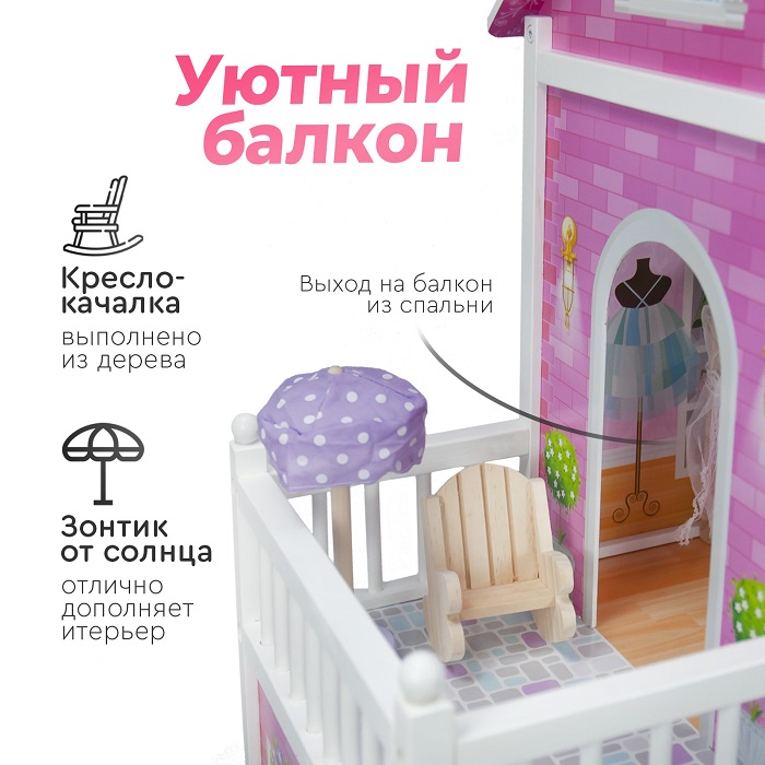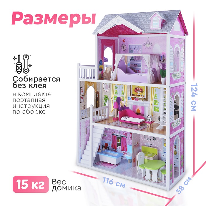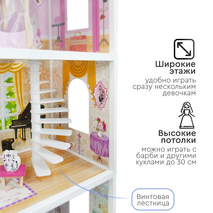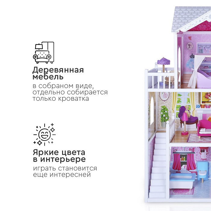 Дом для кукол Tomix Aria (Томикс Ария) - большой, яркий и безопасный дом для кукол уже с мебелью в комплекте. Один из лучших подарков для девочки от 3 лет. Дом имеет 3 этажа, винтовую лестницу и выход на балкон. Домик достаточно высокий и отлично подойдет для кукол барби и других кукол до 30 см в высоту. Домик имеет удобные габариты для совместных игр нескольких детей. Он крепкий, надежный и имеет прочную деревянную конструкцию. Собирается с помощью понятной поэтапной инструкции (для сборки понадобится крестовая отвертка). У всех элементов дома закругленные края, что делает игру безопасной для маленьких детей.