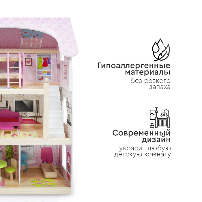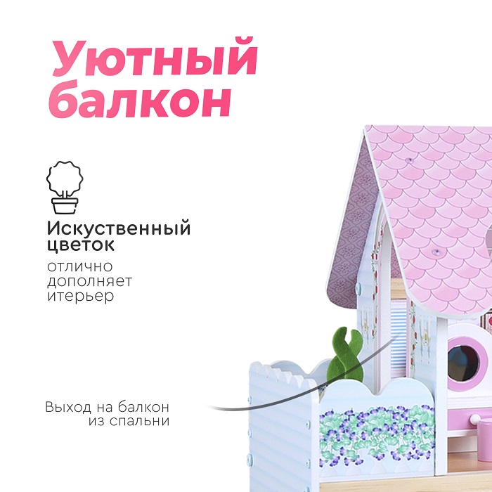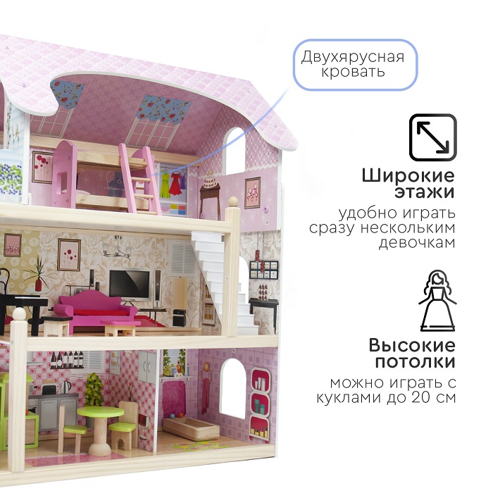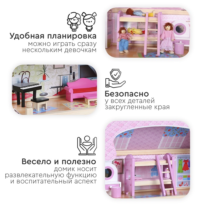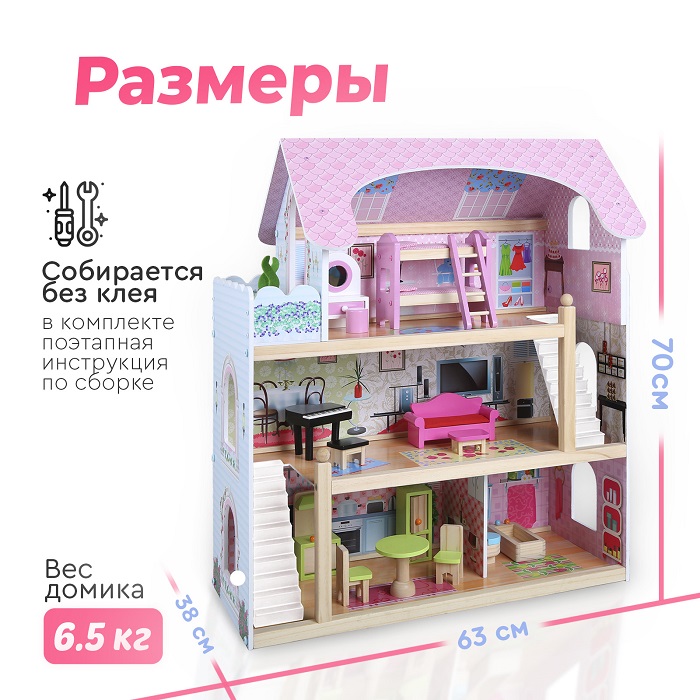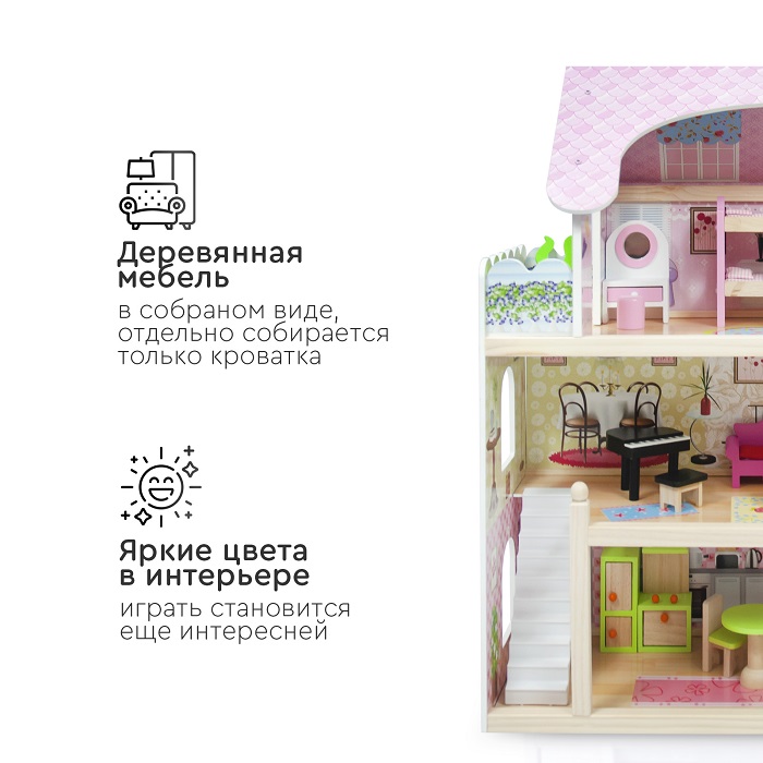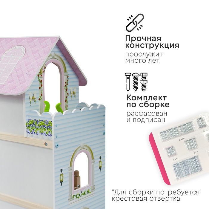 Нежные цвета интерьера придутся по душе маленьким принцессам! Дом имеет прочную деревянную конструкцию, благодаря чему прослужит много лет. Собирается с помощью понятной поэтапной инструкции (для сборки понадобится крестовая отвертка). У всех элементов дома закругленные края, что делает игру безопасной для маленьких детей.