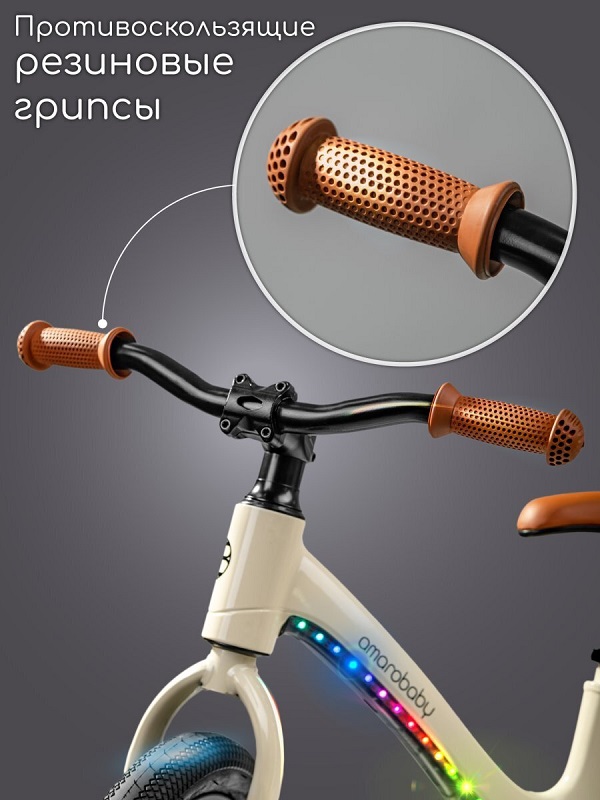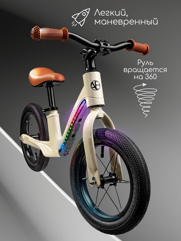 Стильный дизайн с яркой подсветкой рамы позволит ребенку выделяться среди сверстников и оставаться заметным даже в темное время суток. Надувные колеса обеспечат хорошую амортизацию (для подкачки колес вам понадобится любой велосипедный насос), мягкий ход по любым дорогам и дополнительную безопасность. Велобег имеет руль, который вращается на 360 градусов, что позволяет ребенку легко маневрировать и управлять им во время езды. Под сидением предусмотрена удобная ручка для переноски беговела.