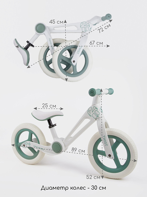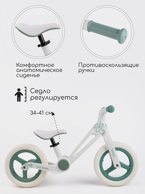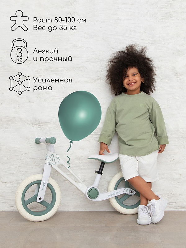 Детский беговел AmaroBaby Twist (амаробеби твист) - уникальный транспорт для ребенка от 3 лет, ростом от 80 до 100 см и весом до 35 кг. Велосипед без педалей, велобег, как только не называют этот транспорт. Он максимально прост в использовании, но дает ребенку колоссальные возможности. Во-первых, скорость передвижения, активные и интересные прогулки. Во-вторых, укрепление ног, развитие баланса и координации, тренировка внимания. В-третьих, быстрый и легкий переход на двухколесный велосипед в дальнейшем.