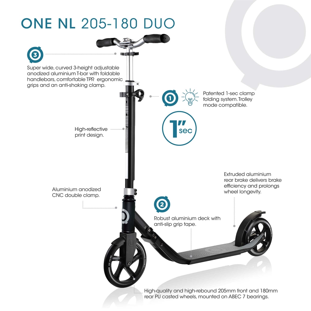 Двухколесный самокат Globber NL205-180 DUO (Глоббер НЛ205-180 Дуо ) - современный городской транспорт для ребенка от 8 лет и взрослых до 100 кг. Наделён всеми необходимыми качествами для надёжности и удовольствия! Широкая алюминиевая платформа самоката с нескользящим рельефом для устойчивости и стабильности при катании. Удобный складной механизм для компактного хранения или транспортировки приводится в действие, когда вы тянете за ушко в верхней части руля. Эргономичные ручки руля складываются и фиксируются зажимом, исключая дребезжание и люфт. Колёса самоката с качественными подшипниками (переднее 205 мм, заднее 180 мм) гарантируют хорошую скорость и комфорт. Задний ножной тормоз металлический, стойкий к истиранию и долговечный. Идеальный помощник в каменных джунглях с сумасшедшим ритмом и трафиком!