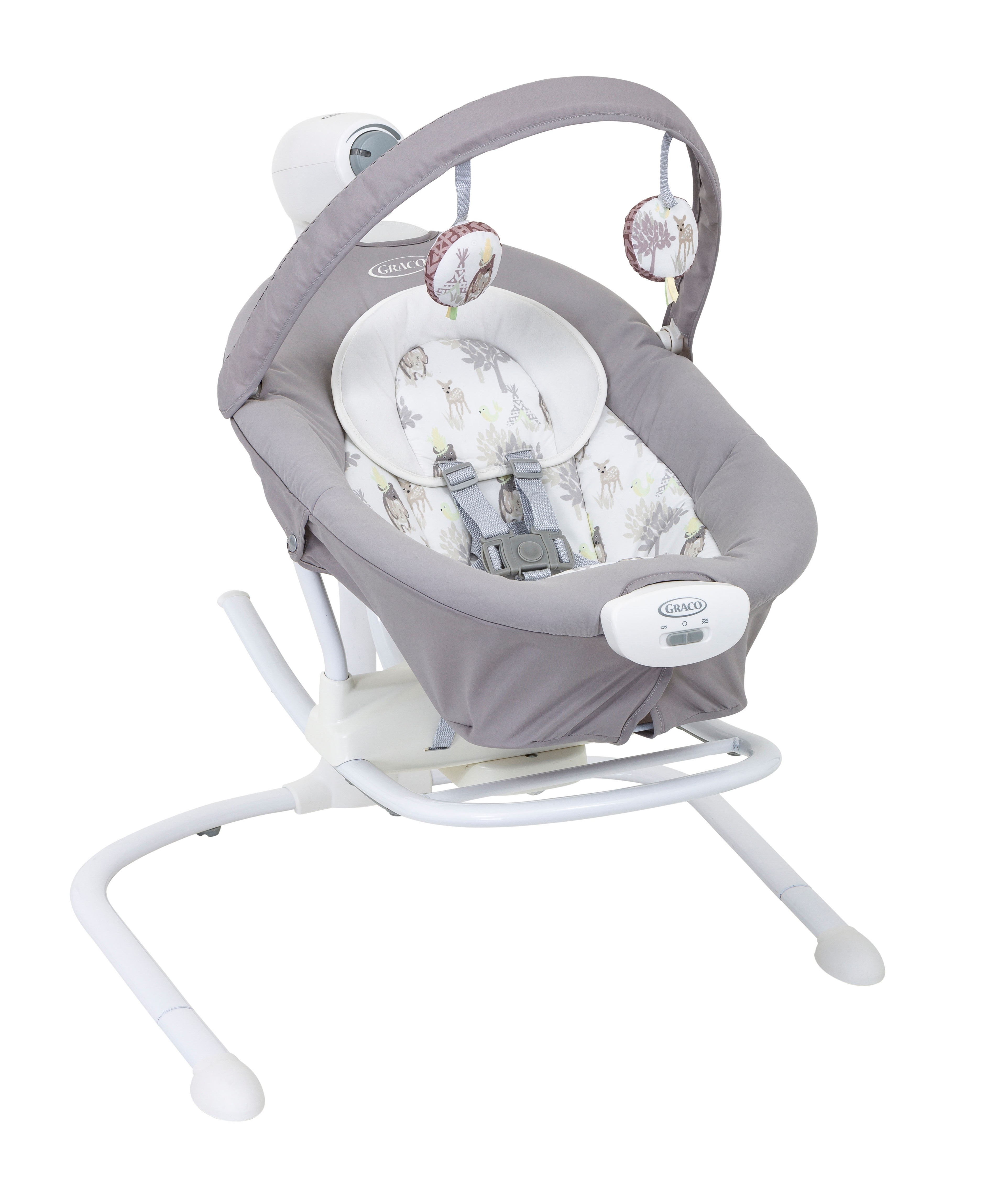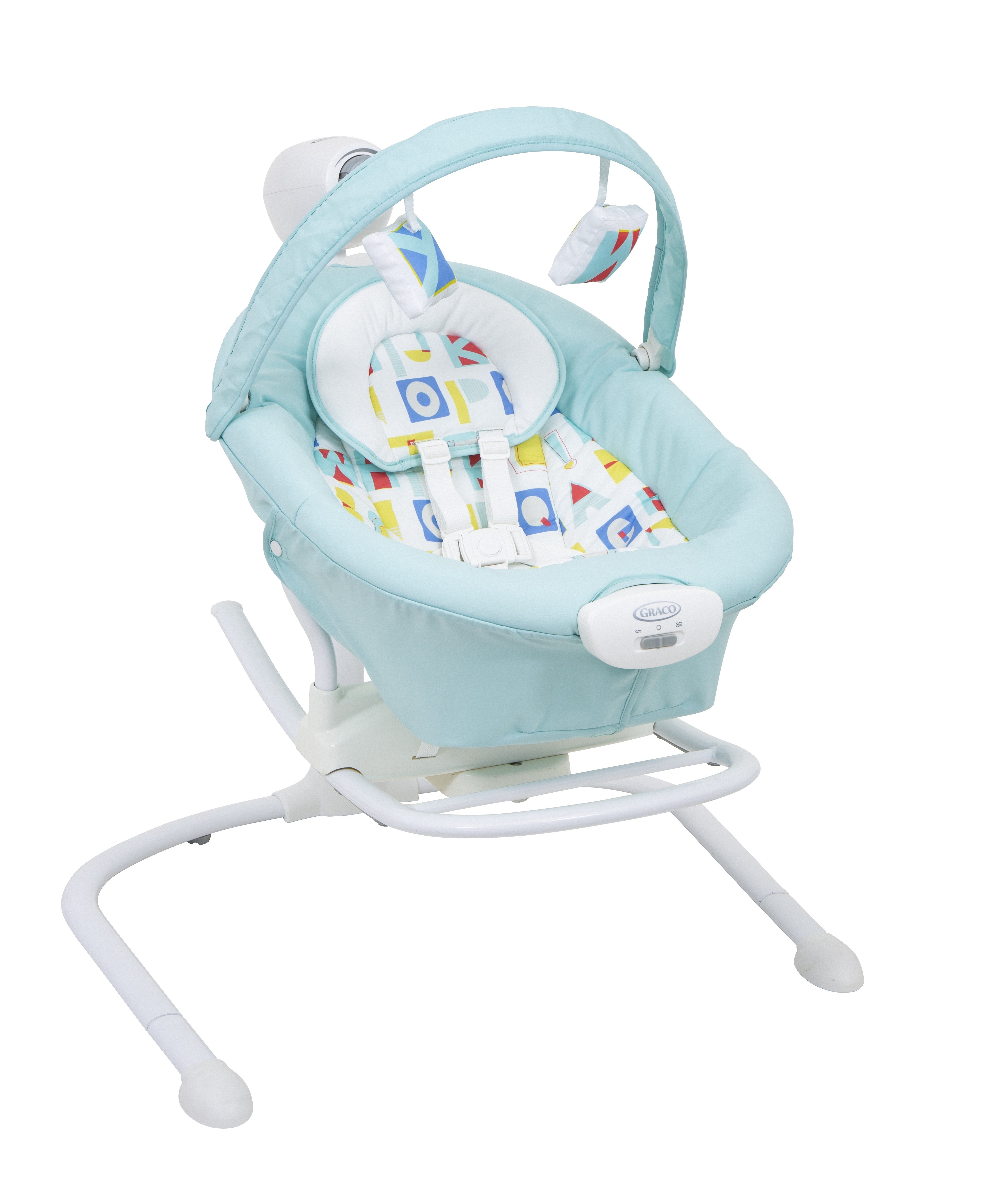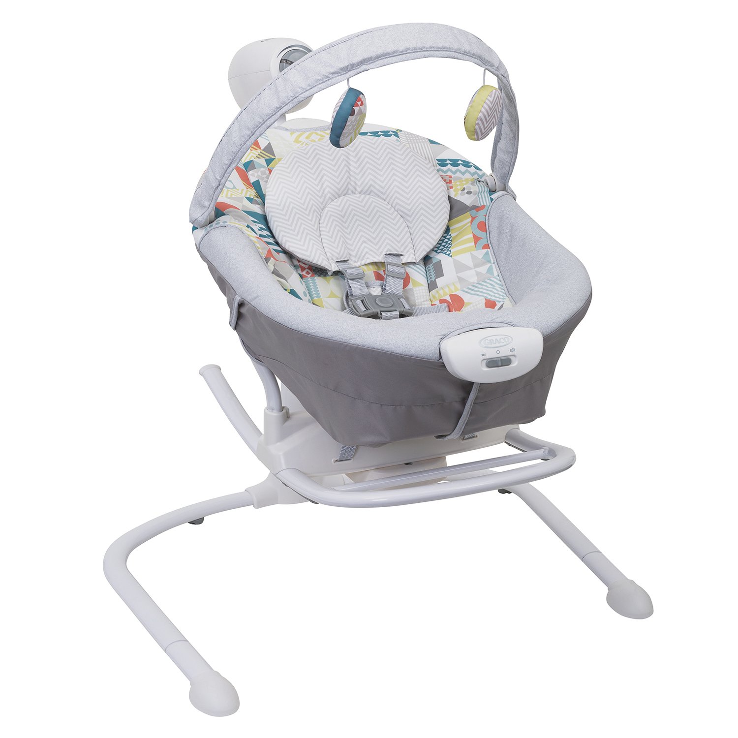 Электрокачели Graco DUET SWAY 2 в 1 (Грако Дует Свей) - очень комфортная и продуманная модель качелей-шезлонга 2 в 1 для ребенка с рождения до 9 месяцев. Большим преимуществом данной модели является возможность качать ребенка из стороны в сторону или вперед-назад. Такой выбор позволит вместе с регулируемой скоростью и вибрацией подобрать именно то качание, которое больше всего понравится ребенку. Качели созданы для малышей с рождения, поэтому у них очень качественная дышащая обивка, удобный подголовник, и регулируемая спинка до почти горизонтального положения.