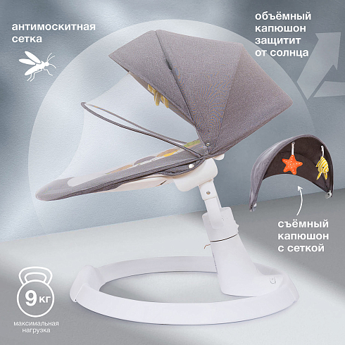 Качели управляются с помощью пульта управления, Bluetooth и имеют USB порт для подключения накопителей с любимыми мелодиями. Предусмотрено использование качелей не только дома, но и на свежем воздухе, для этого качели оснащены защитным капюшоном и москитной сеточкой от насекомых.