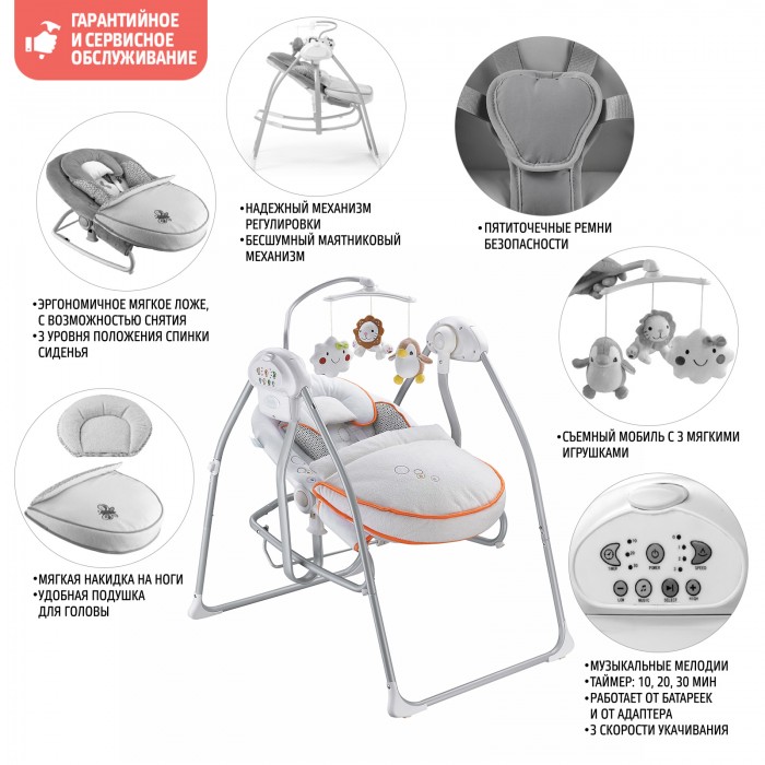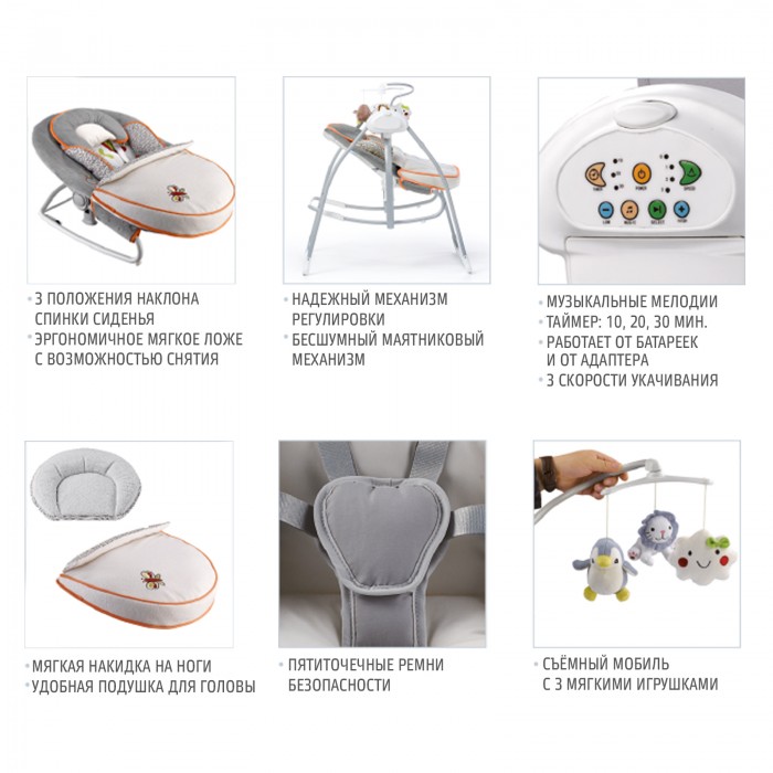 Электрокачели Nuovita Migliore (нуовита миглиор) – надежное и уютное место для сна и игр для малыша до 6 месяцев. Подарит уют и комфорт, окутает теплом, и нежно убаюкает, как мамины руки. Преимуществом этих качелей является возможность использовать чащу качелей, как полноценный шезлонг с 3-мя уровнями положения спинки. Ваш малыш будет всегда рядом с вами, а вы сможете заняться своими делами. Устройство выполнено очень аккуратно, надежно и абсолютно безопасно для ребенка. Мягкая обивка очень приятна на ощупь, а анатомическая подушечка для головы создана специально, чтобы вашему ребенку было максимально удобно и комфортно.