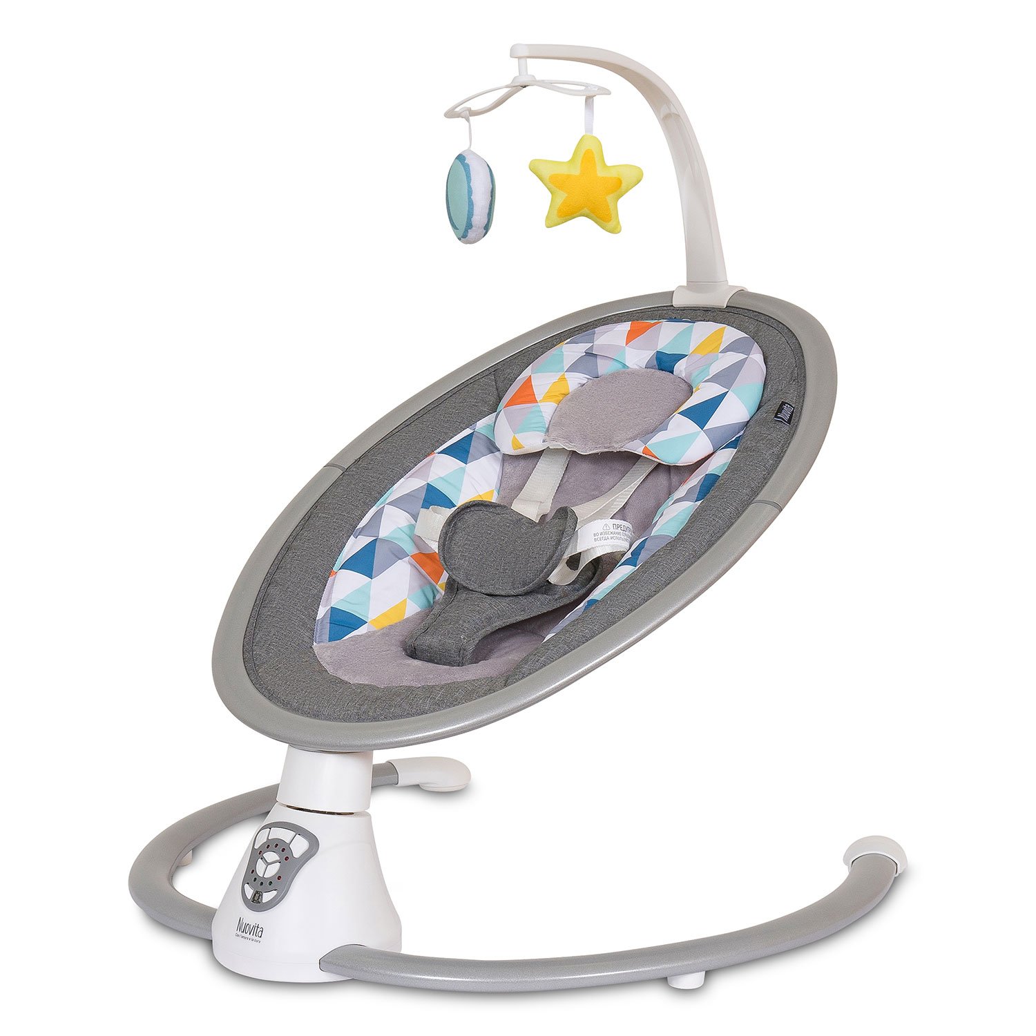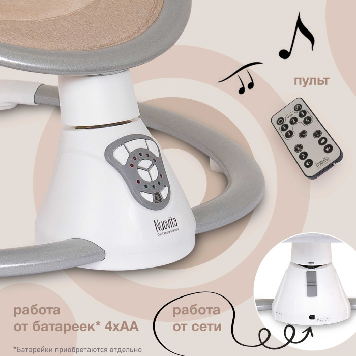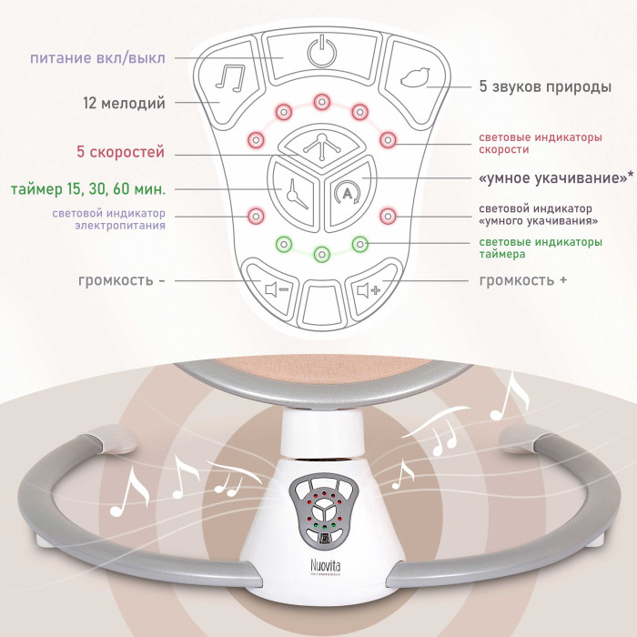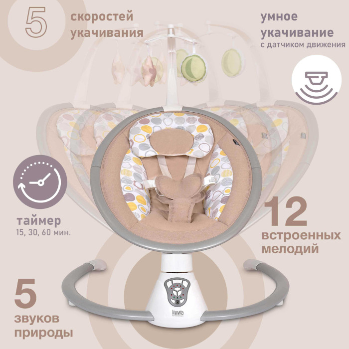 Электрокачели Nuovita Mistero MS4 (Нуовита Мистеро) - компактные электрокачели для новорожденных с просторным и удобным ложем, которые совершают плавные покачивания из стороны в сторону, успокаивая и убаюкивая малыша. Родители могут выбрать одну из 5 скоростей, выставить таймер или активировать умное укачивание с датчиком движения. Качание сопровождается приятными мелодиями и звуками природы. Электрокачели шезлонг можно использовать с рождения до момента, когда ребенок попытается сидеть самостоятельно (максимальный вес 9кг).
