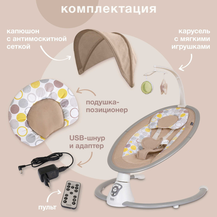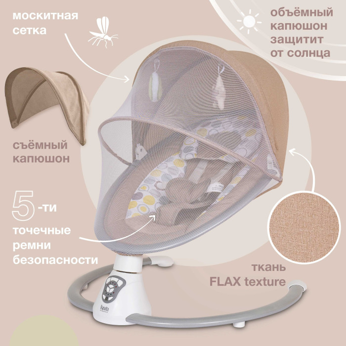 • Наличие 5 скоростей качания позволяет подобрать наиболее удобный для малыша режим. Таймер можно установить на 15, 30 или 60 минут.