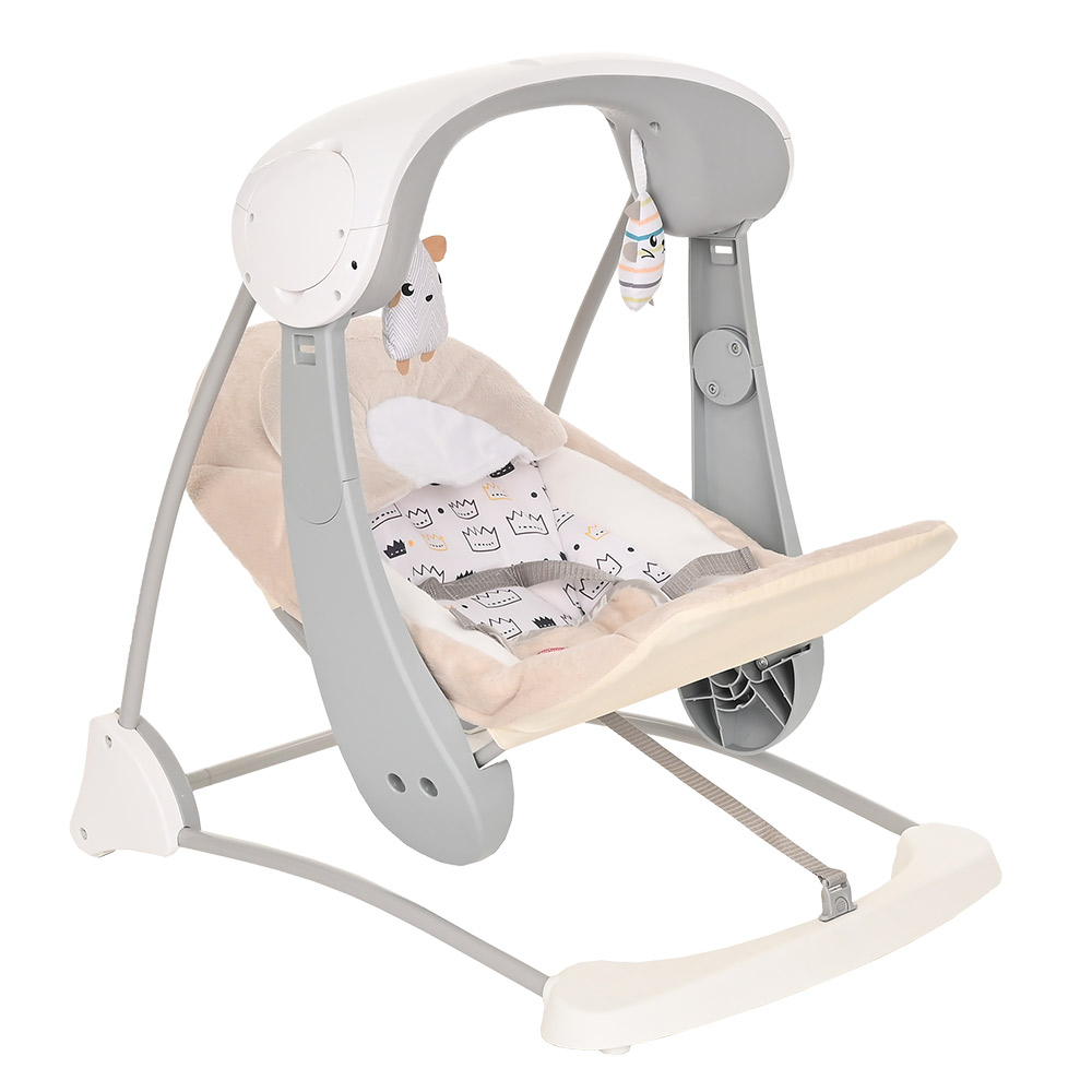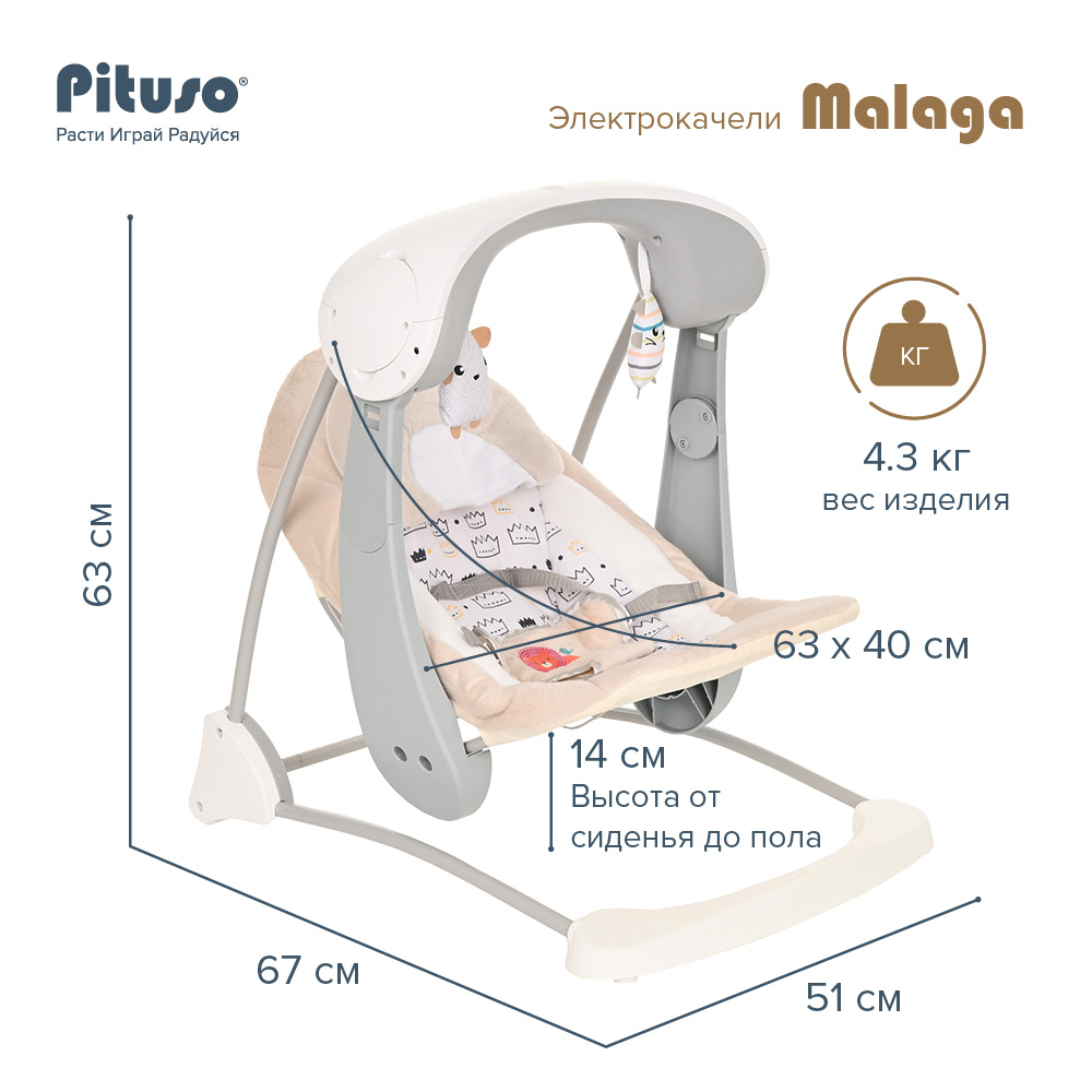Электрокачели PITUSO Malaga (Питусо Малага) - незаменимая вещь в семье с маленьким ребенком. Гарантировано подарит ребенку комфорт и безопасность, а родителям - свободное время. Нежно убаюкает ребенка, отвлечет от прорезывания зубов, разовьет мелкую моторику, координацию рук и глаз, улучшит хватательные рефлексы. Стальной корпус изготовлен из прочного материала, ткань подкладки мягкая и удобная, заботится о детской коже. Качели оснащены музыкой с регулировкой громкости и съемной дугой с мягкими игрушками. При необходимости качели очень быстро и удобно складываются.