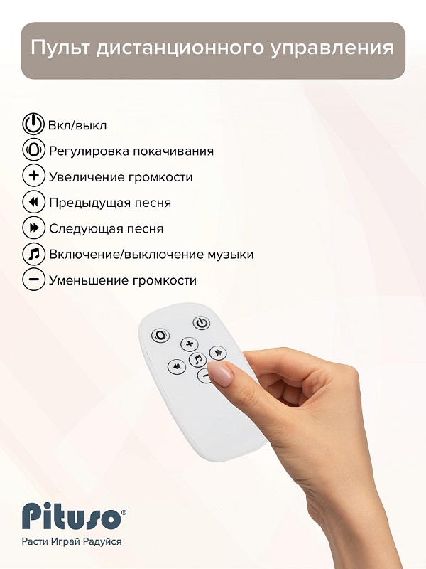 Купить Электрокачели PITUSO RIMA (питусо рима) в нашем магазине очень просто — Вам достаточно оформить заказ онлайн на сайте или по телефону +7(925)266-83-06. Мы доставим товар в самое короткое время по Москве и Подмосковью (бесплатно до 10 км за МКАД). Так же отправляем в любой город России, в Армению, в Киргизию, в Крым, в республику Беларусь с помощью транспортной компании.