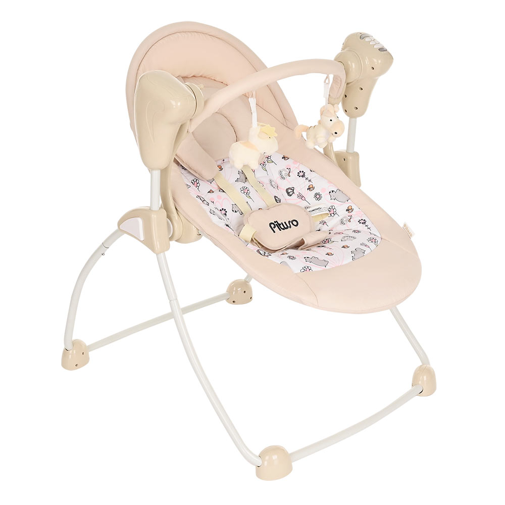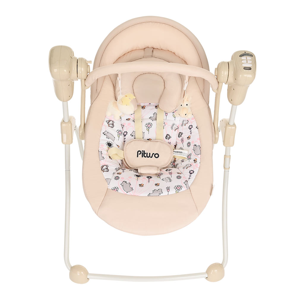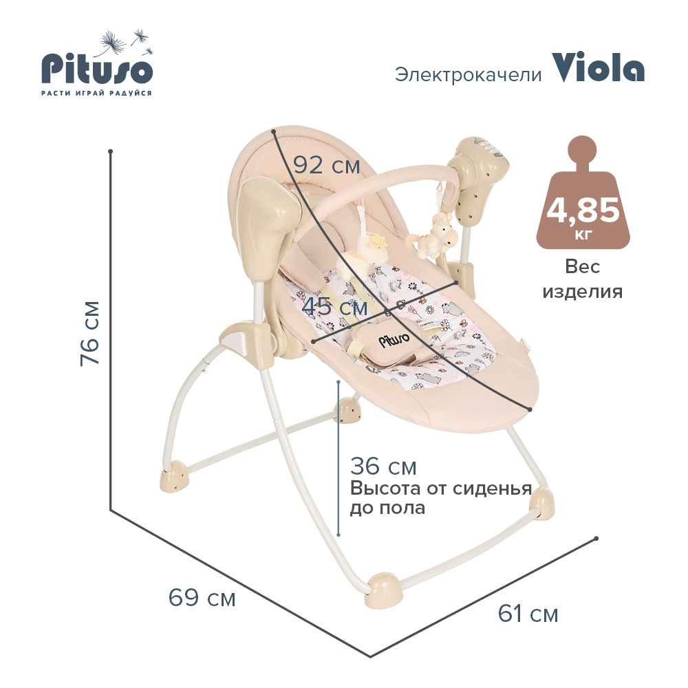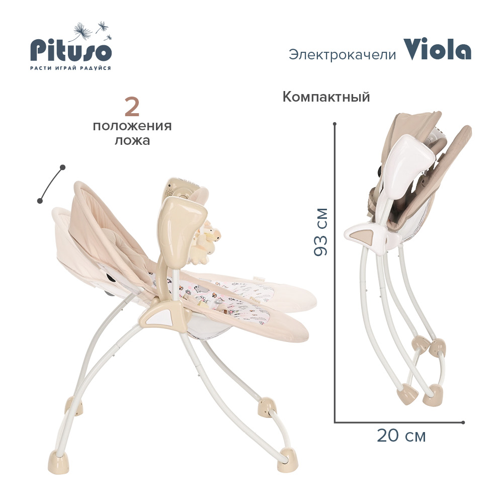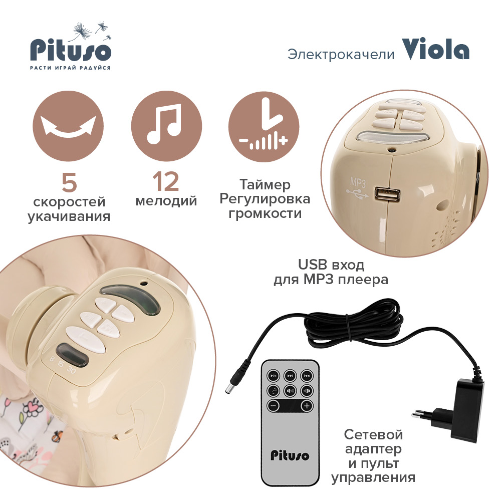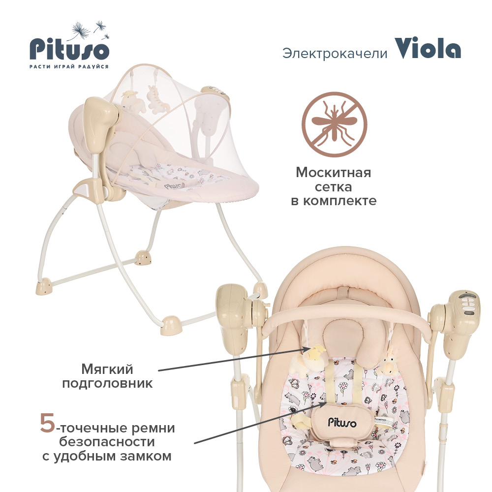 Электрокачели PITUSO VIOLA (Питусо Виола) - удобное устройство для укачивания, а так же для приятного времяпрепровождения ребенка во время бодрствования. Компактные и легкие качели легко установить в любой комнате, на кухне, на свежем воздухе. Комфортное сидение с 5-ти точечными ремнями безопасности имеет 2 положения наклона спинки. Для летнего периода времени предусмотрена антимоскитная сетка, которая защитит малыша от назойливых насекомых. Качели оснащены 5 скоростями качания, музыкой с регулировкой громкости, таймером. Легко управляются с помощью панели на качелях или с помощью пульта управления. Очень компактно складываются.