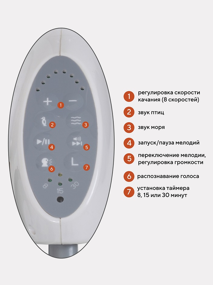 - можно задать время укачивания (8, 15, 30 минут). Малышу этого хватит, чтобы заснуть сладким сном.