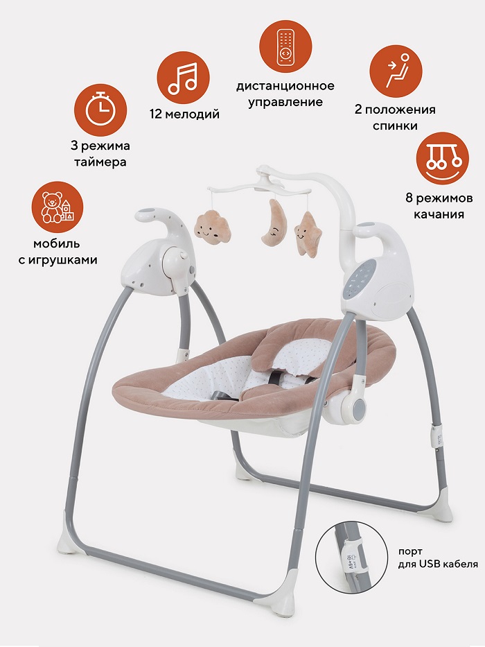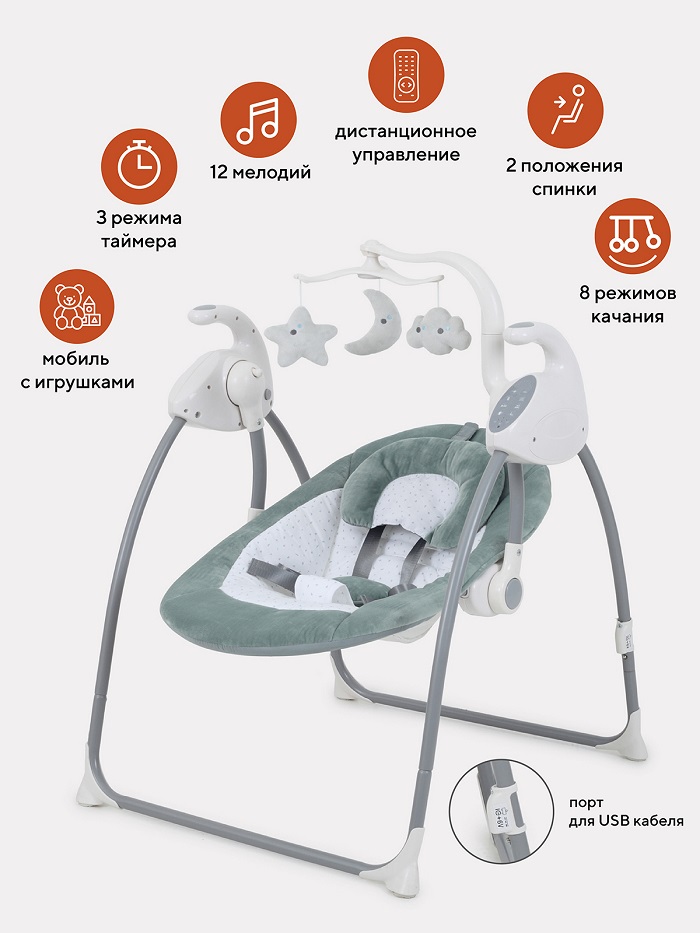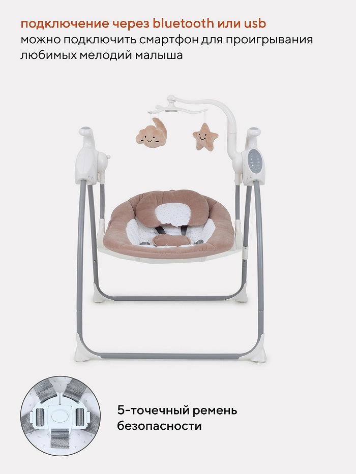 - по желанию к электронным качелям, через Bluetooth или USB, можно подключить смартфон для проигрывания любимых мелодий малыша