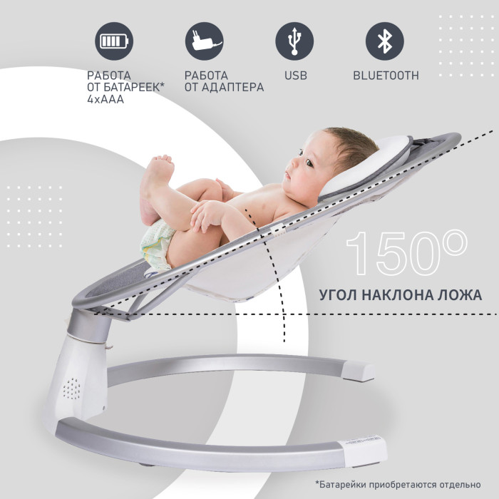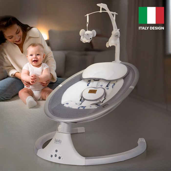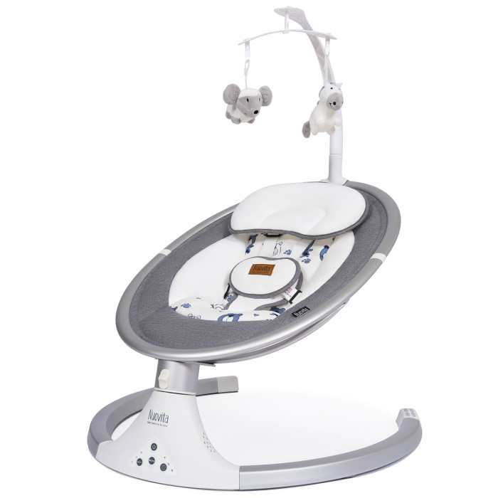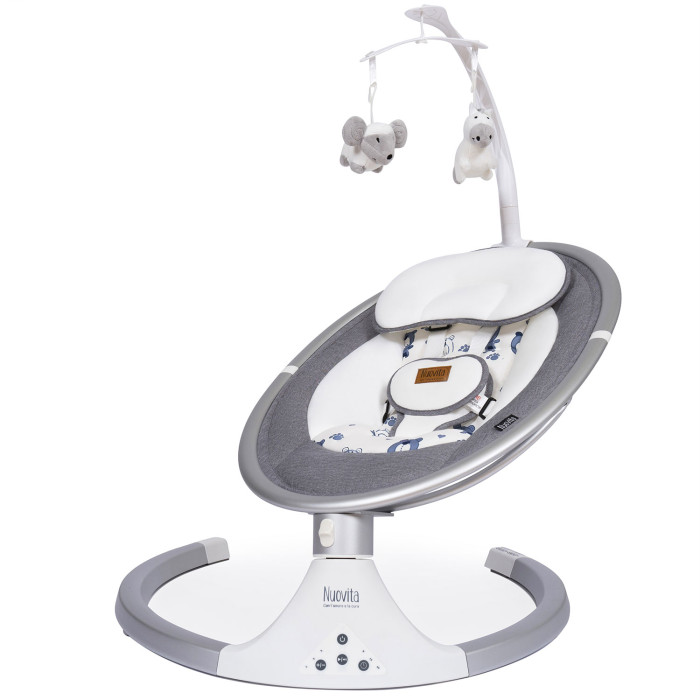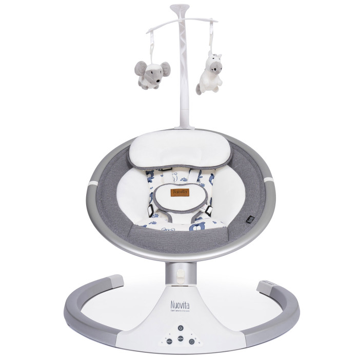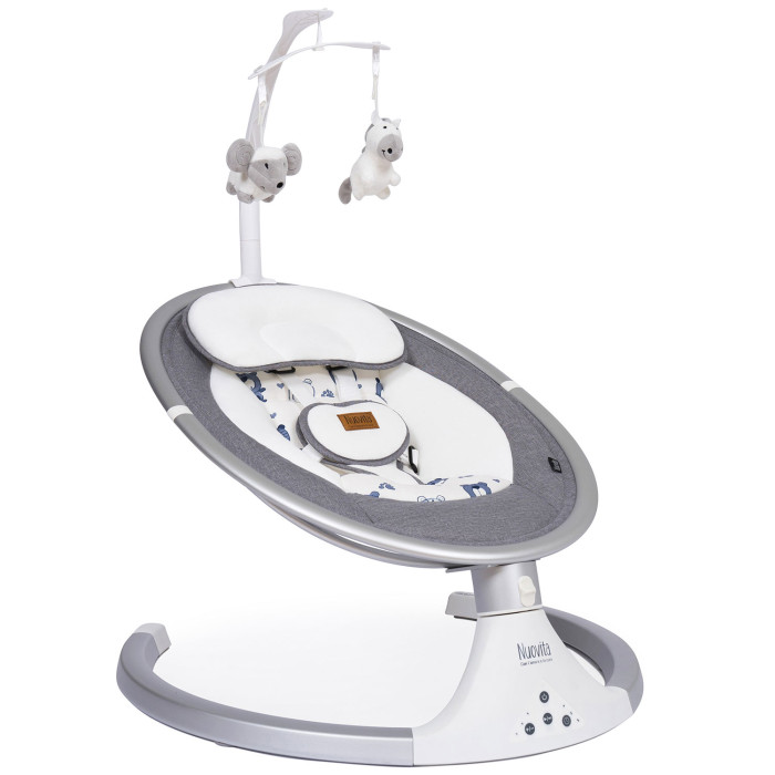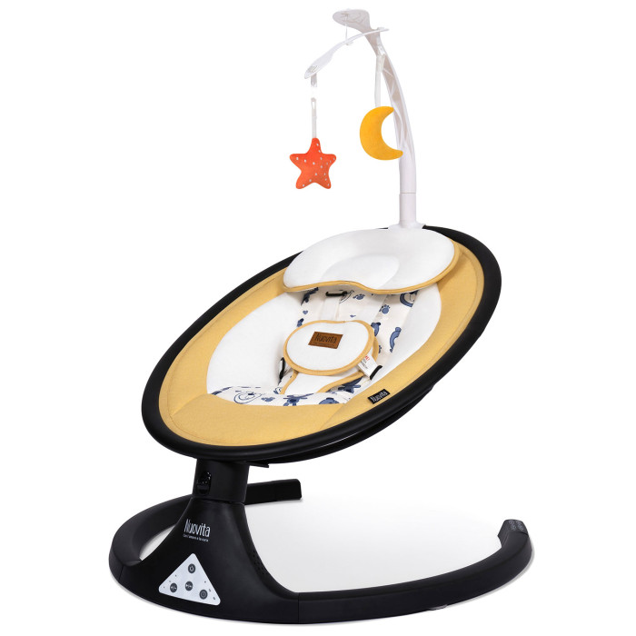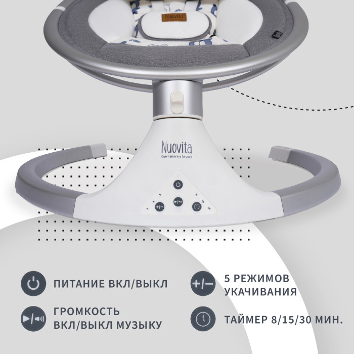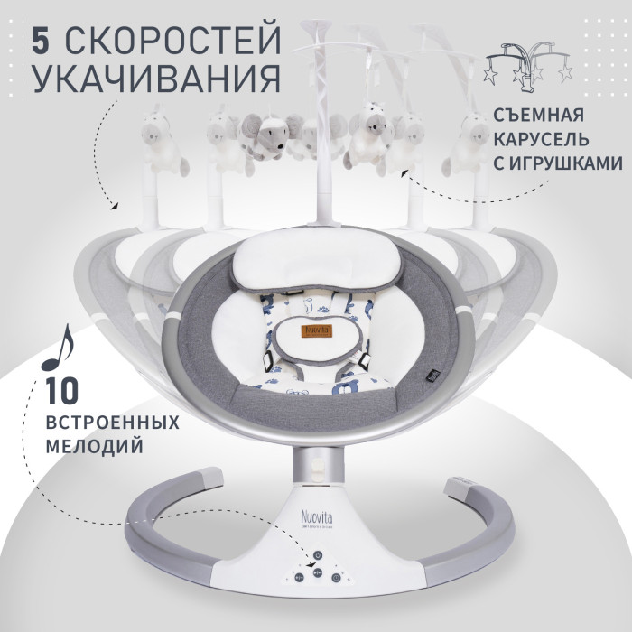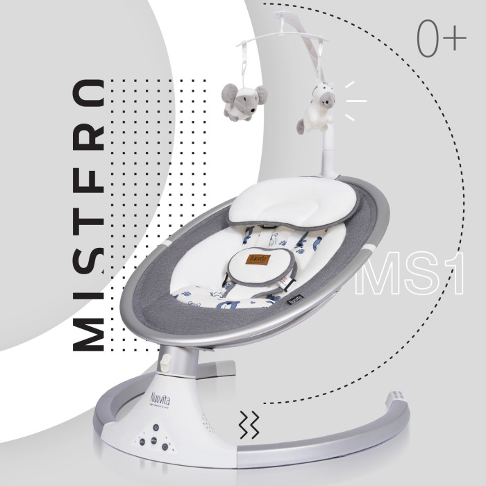 Электрокачели-шезлонг Nuovita Mistero MS1 (Нуовита Мистеро) - возьмут заботу об укачивании младенца на себя, подарив родителям драгоценные минуты отдыха, а малышу — приятный и интересный досуг. В числе преимуществ данной модели — пять режимов укачивания, которые позволяют подобрать именно те скорость и амплитуду, которые требуются в конкретный момент, таймер для установки раскачивания на определенное время, возможность работы как от сети, так и от батареек и небольшой вес, благодаря чему электрокачели удобно переносить из комнаты в комнату. Вращающийся мобиль с плюшевыми игрушками надолго привлечет внимание малыша, а функция воспроизведения музыки с родительского смартфона через Bluetooth предоставит поистине безграничный выбор мелодий. Все эти возможности сделают пребывание младенца в шезлонге максимально комфортным.
