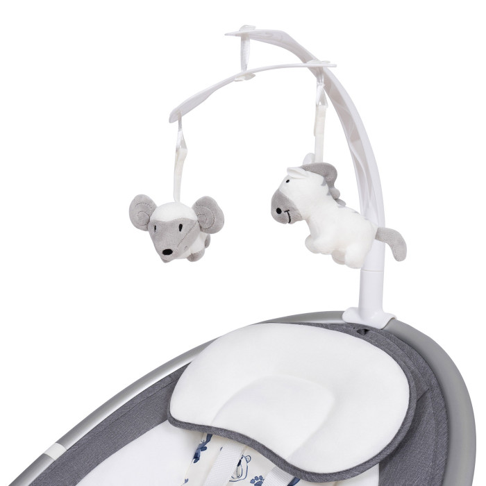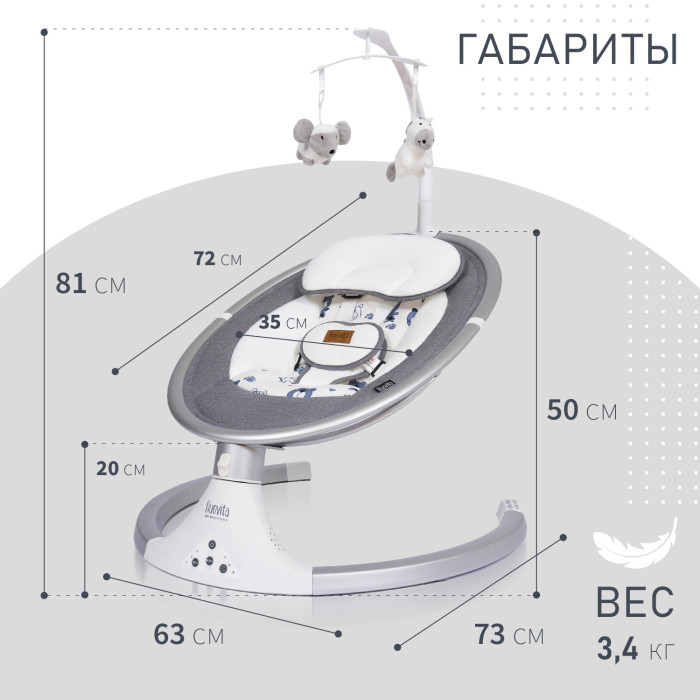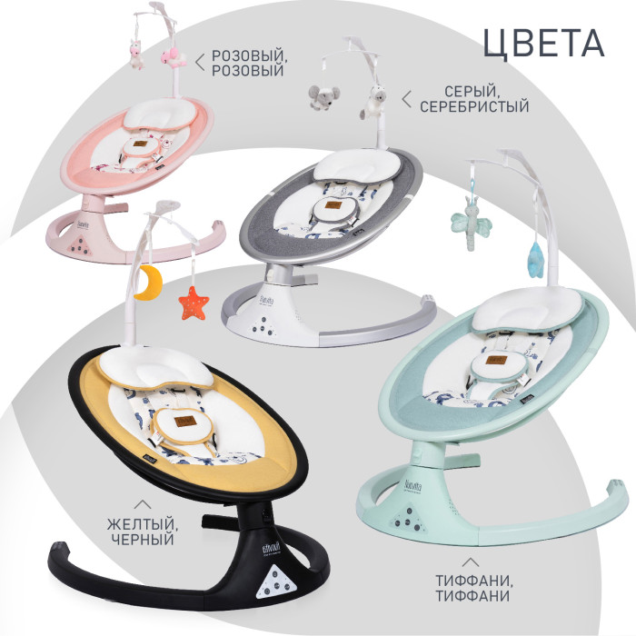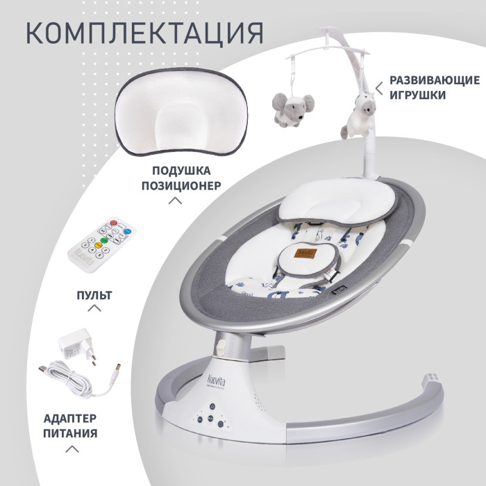 Комплектация: Электрокачель, мобиль с 2-мя игрушками, пульт ДУ, адаптер питания.