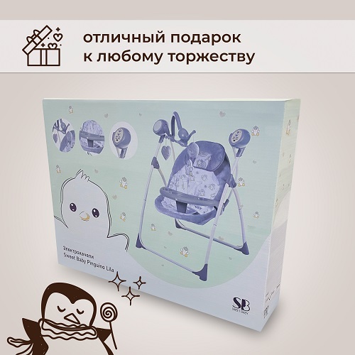 Купить электрокачели Sweet Baby Lila Pinguino 2 в 1 (Свит беби пингвино) в нашем магазине очень просто — Вам достаточно оформить заказ онлайн на сайте или по телефону +7(925)266-83-06. Мы доставим товар в самое короткое время по Москве и Подмосковью (бесплатно до 10 км за МКАД). Так же отправляем в любой город России, в Армению, в Киргизию, в Крым, в республику Беларусь с помощью транспортной компании.