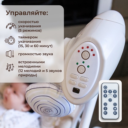 - Музыкальное сопровождение: 12 мелодий и 5 звуков природы. Есть USB разъем для любой музыки.