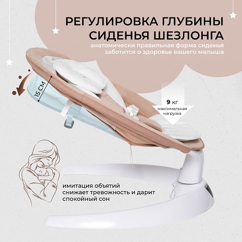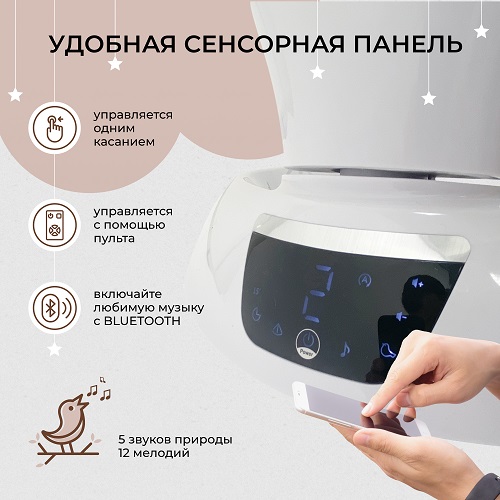 - 5 скоростей укачивания. Пятискоростной режим укачивания подстроится под личные особенности каждого младенца