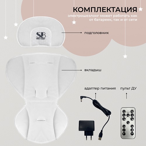 - Работа от сети или батареек. Sweet Baby Matteo Lux способны работать как от адаптера (входит в комплект), так и от 4 батареек типа АА ( в комплект не входят).