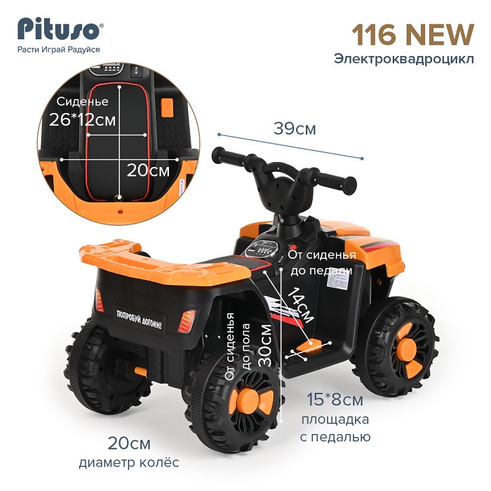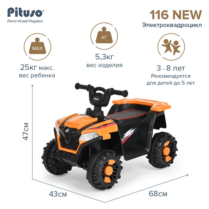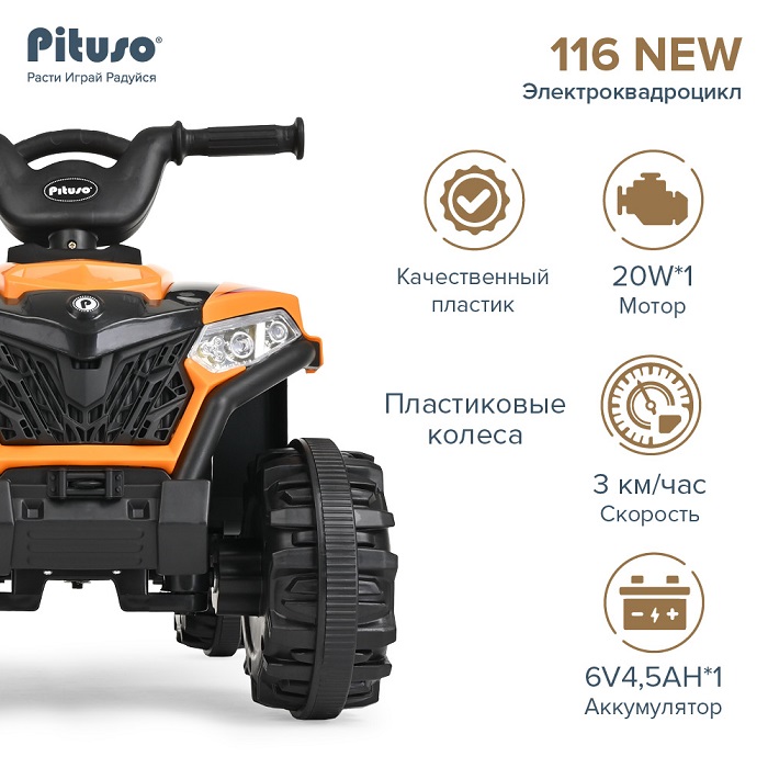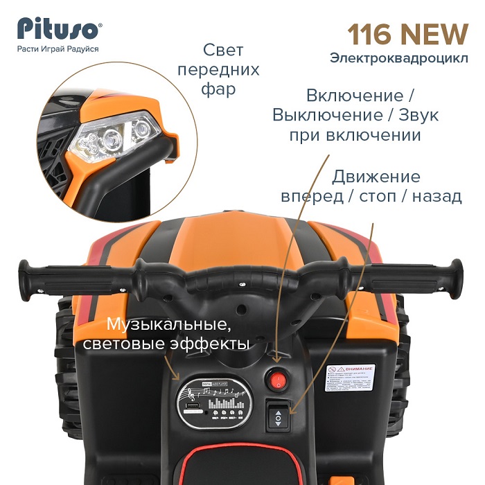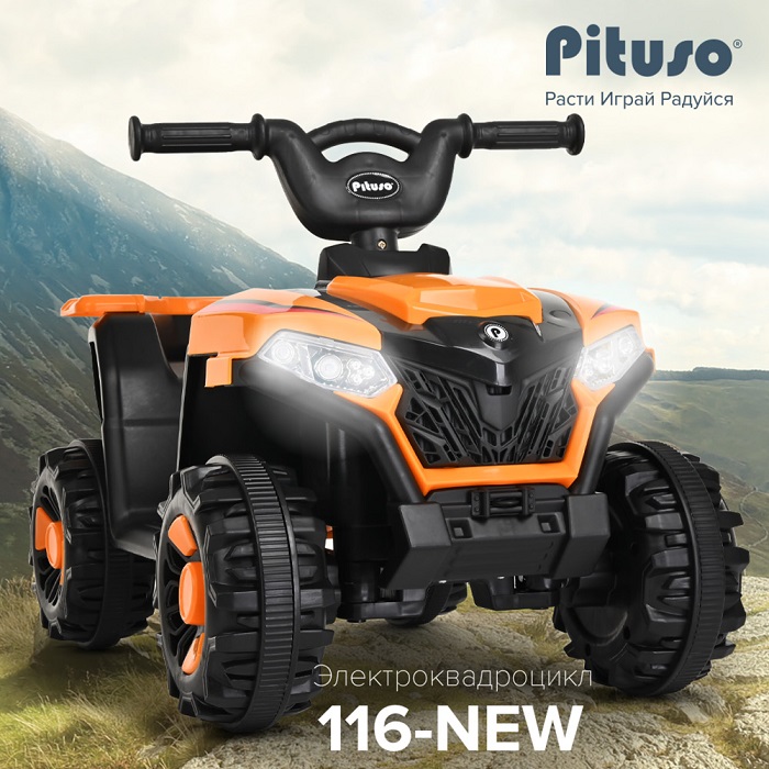 Электроквадроцикл PITUSO 2600005 (питусо)- детская электромашина для ребенка от 2-3 лет. Машина может двигаться вперед со скоростью 3 км/час, и назад. Модель достаточно проста в управлении, поэтому малыш быстро разберется, как управлять транспортом. Кожаное сидение имеет удобные габариты. Для более увлекательной поездки электроквадроцикл оснащен музыкой на русском языке, а так же светом передних фар и звуком при старте. Колеса большого диаметра позволят ребенку легко преодолевать небольшие препятствия на своем пути и получать удовольствие от вождения.