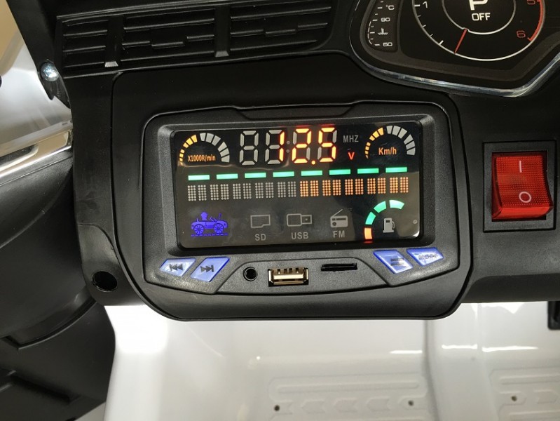 Большие каучуковые колеса с амортизаторами делают машинку проходимой по бездорожью и обеспечивают хорошее сцепление с любым дорожным покрытием. Два двигателя суммарной мощностью в 70 W позволяют кататься со скоростью до 7-ми км/ч. Электромобиль оснащен настоящей магнитолой с возможностью проигрывания музыки с флэшки или Sd карты, а также удобным музыкальным рулем.