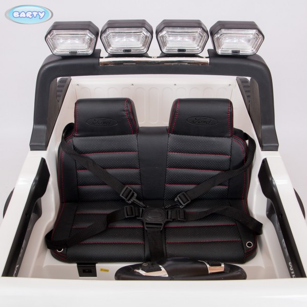 В салоне детской машины Ford Ranger F650 есть 2 кожаных сиденья с очень удобными спинками и подголовниками. За безопасность ребенка отвечают пяти точечные ремни безопасности и замки для блокировки дверей.