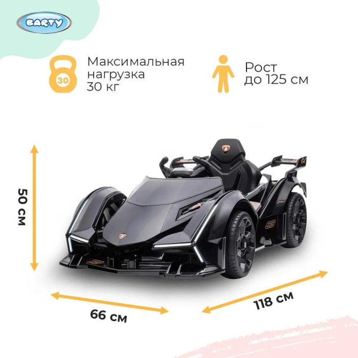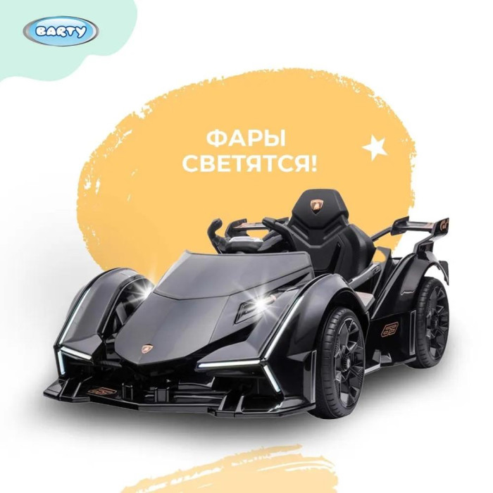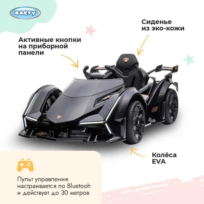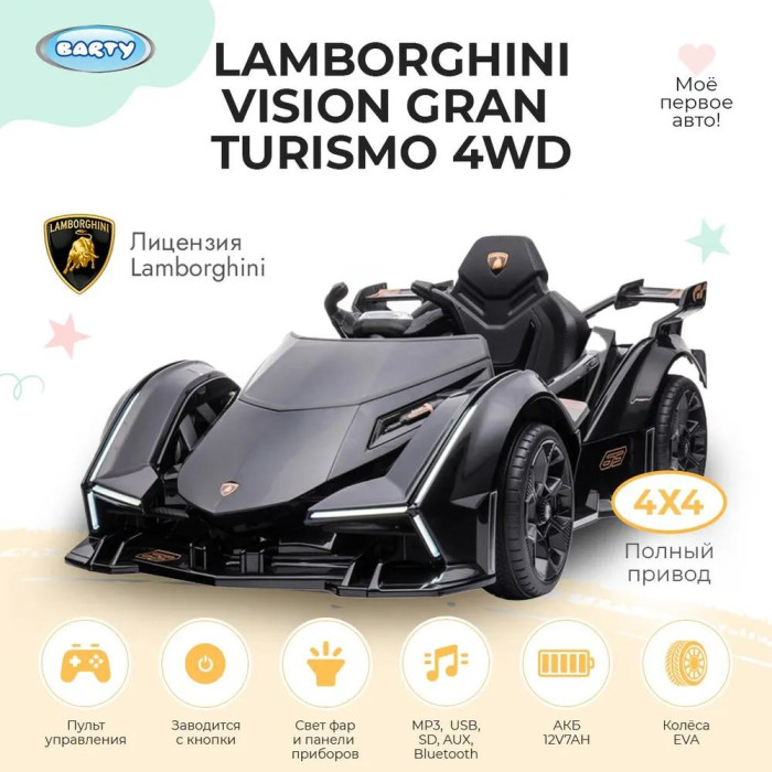 Электромобиль Barty Lamborghini Vision Gran Turismo 4WD HL528-LUX (Барти Ламборджини вижен гран) - не машина, а настоящая мечта для любого ребенка. Очень красивый, спортивный, гоночный болид в невероятно стильных расцветках. Он очень похож на настоящий, но по комфорту внутри салона даст фору даже настоящей машине. Для вашего ребенка предусмотрено комфортное кожаное сидение с ремнями безопасности. MP3 магнитофон с разъемом USB, SD, AUX и Bluetooth позволит слушать любимые треки ребенка во время прогулки. Звуковые и световые эффекты усилят эмоции ребенка во время управления транспортом. Машина управляется не сложно и рассчитана для ребенка от 1 года. Для комфортной поездки предусмотрены 3 скорости вперед и 1 назад.
