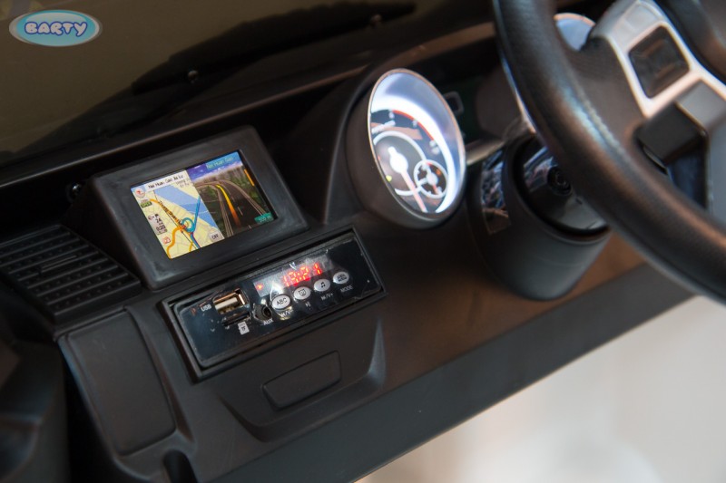 Электромобиль рассчитан на одно посадочное место. В салоне машинки ребенок будет чувствовать себя комфортно на большом кожаном сиденье с высокой спинкой. Две открывающиеся двери отвечают за удобную посадку. Юный водитель может самостоятельно управлять транспортным средством при помощи удобного руля, педали газа-тормоза, зеркал заднего вида. Также малышу доступно три скоростных режима вперед, один – назад.