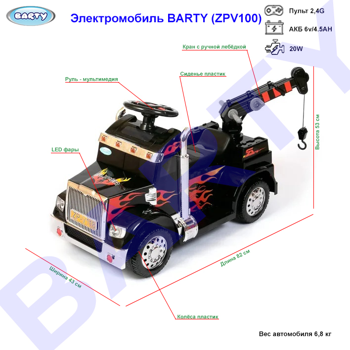 Электромобиль -тягач BARTY ZPV100 (барти) - уникальная аккумуляторная машинка в виде тягача с краном для ребенка от 2 лет. Благодаря интересному дизайну станет любимым транспортам у вашего ребенка. Это не только транспорт который поможет быстро передвигаться ребенку по квартире или по улице, но и функциональная машина с которой будет очень интересно играть.
