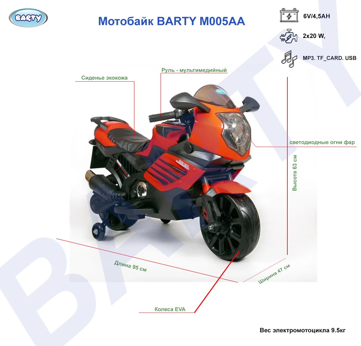 Купить детский электромотоцикл BARTY М005АА (Барти) в нашем магазине очень просто — Вам достаточно оформить заказ онлайн на сайте или по телефону +8(925)266-83-06. Мы доставим товар в самое короткое время по Москве и Подмосковью (бесплатно до 10 км за МКАД). Так же отправляем в любой город России, в Армению, в Киргизию, в Крым, в республику Беларусь с помощью транспортной компании.