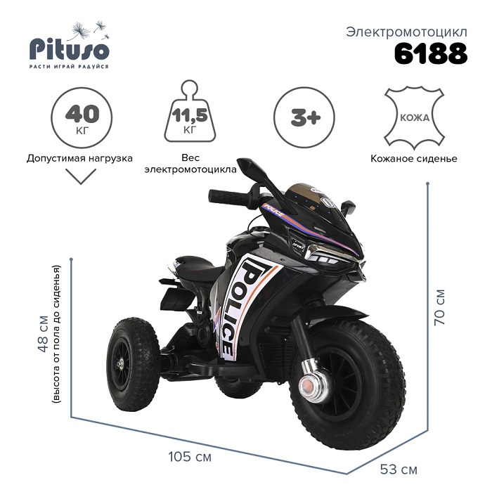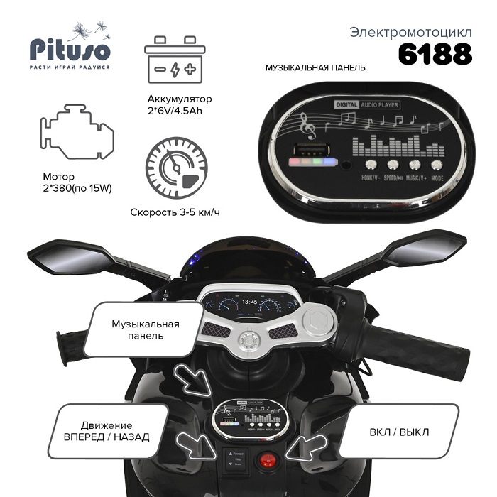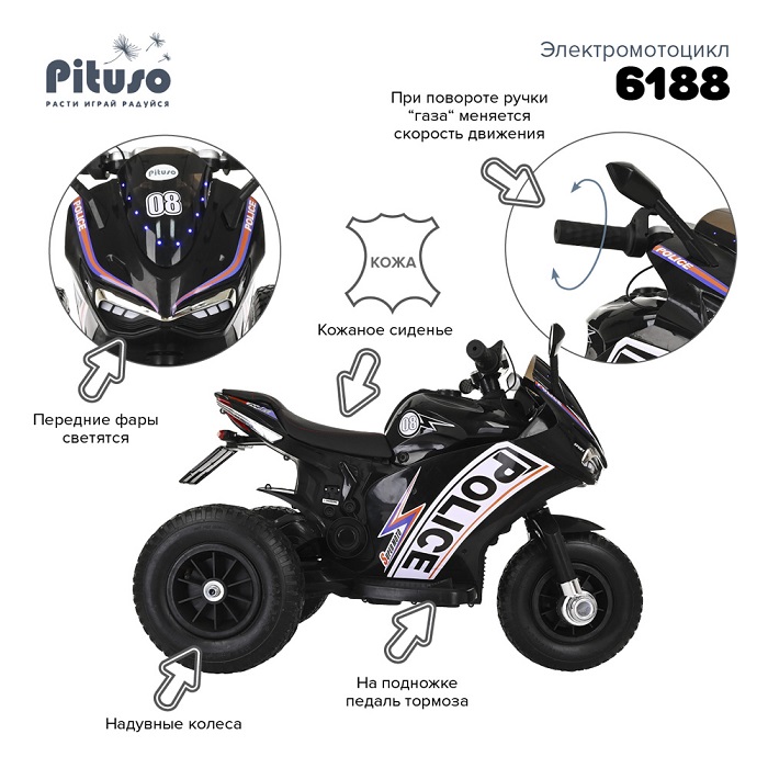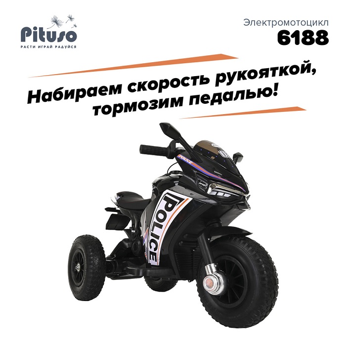 Электромотоцикл PITUSO 6188 (Питусо) - стильный, яркий, современный трехколесный мотоцикл для ребенка от 3 до 8 лет. Отличный подарок на любой праздник. Такая машина точно отвлечет ребенка от телевизора, телефона, планшета и позволит проводить больше времени на улице. Так же мотоцикл развивает мышление, моторику, логику, координацию движений.