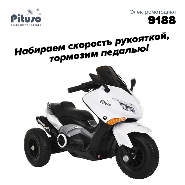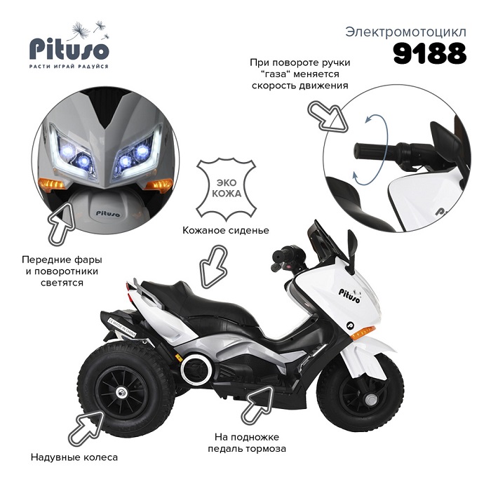 Электромотоцикл PITUSO 9188 (питусо) - стильный детский мотоцикл (скутер) для ребенка от 3 до 8 лет. Оригинальный внешний вид полностью соответствует прекрасному функционалу транспорта. Два задних колеса обеспечат ребенку безопасность и устойчивость. В сочетании с надувными колесами и хорошей скоростью (3-5 км/ч) получается отличный внедорожник, который справится с неровностями дороги и позволит ездить не только по асфальту , но и по бездорожью.