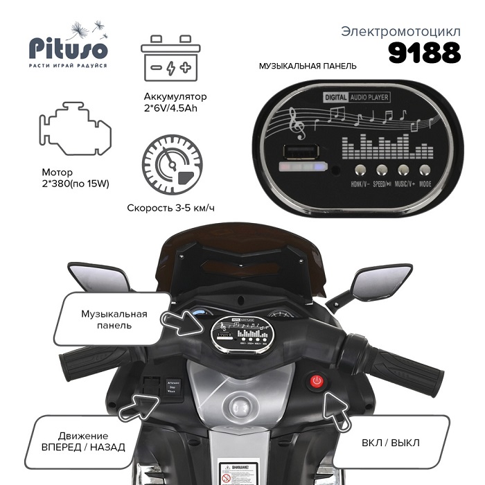 Электромотоцикл PITUSO 9188 - это непросто транспорт для передвижения, это новые увлекательные прогулки на свежем транспорте. Новые друзья на детской площадке. Развитие моторики, внимания, логики и мышления. Отличный подарок на любой праздник.