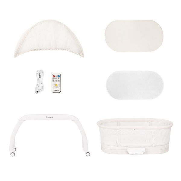 В комплекте: база; кроватка-люлька + матрас; москитная сетка; кабель USB; пульт.