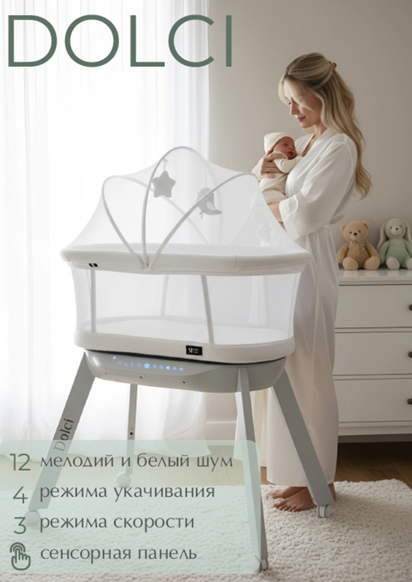 Электронная колыбель Sweet baby Dolci (свит беби дольче) - уникальная мобильная кроватка с несколькими режимами амплитудного качания для новорожденного ребенка. Колыбелька отличается стильным внешним видом, классическими расцветками и компактными размерами, которые позволят органично вписать кроватку даже в небольшую комнату. Колеса придают кроватке мобильность. Вы сможете перемещать кроватку по комнате, квартире, даче.