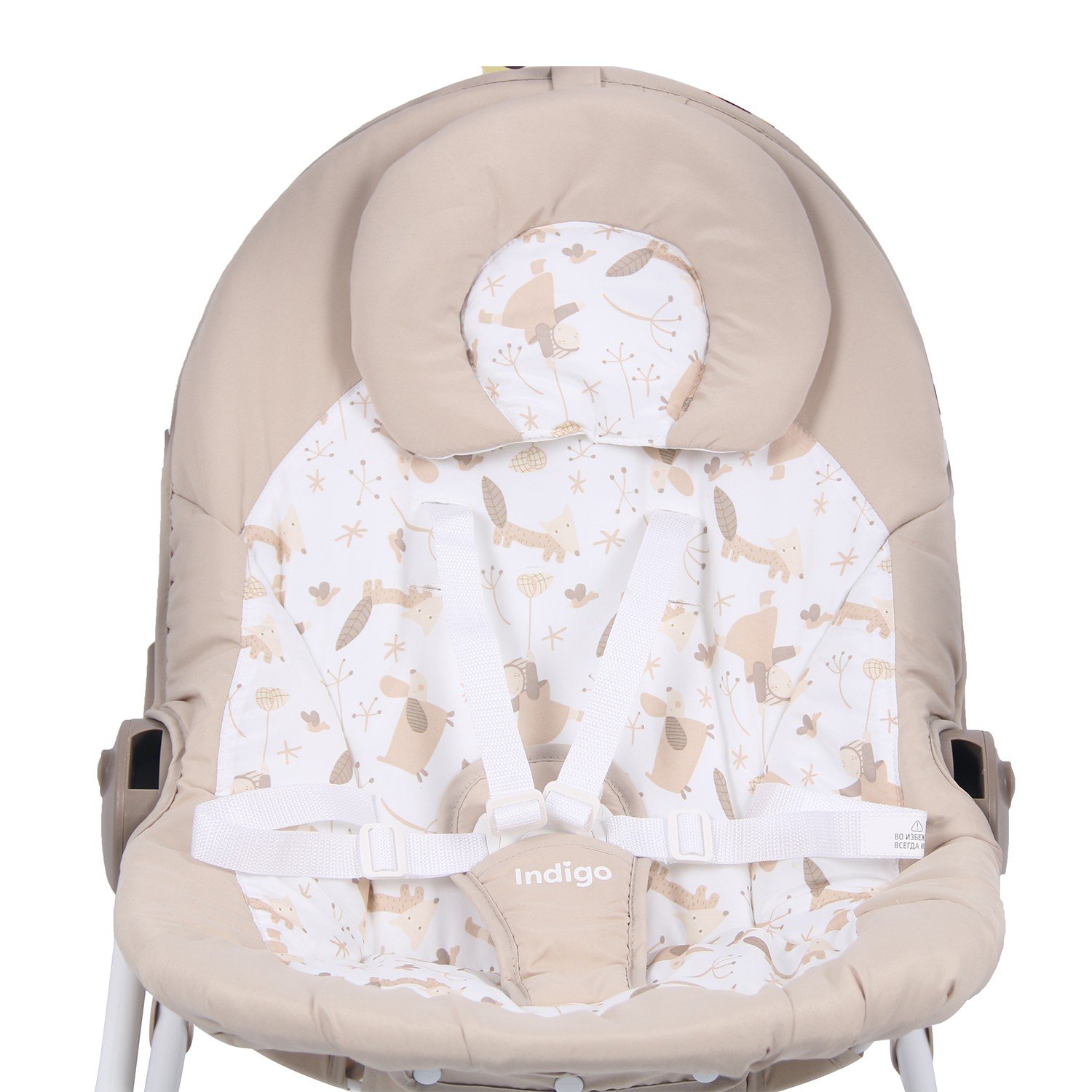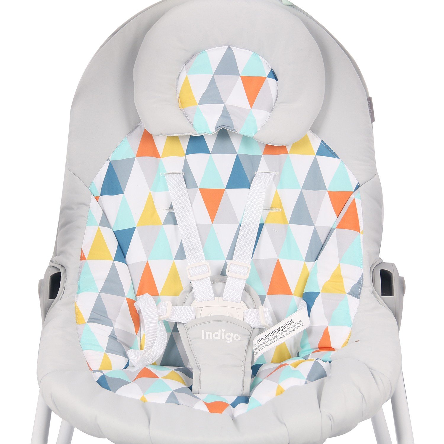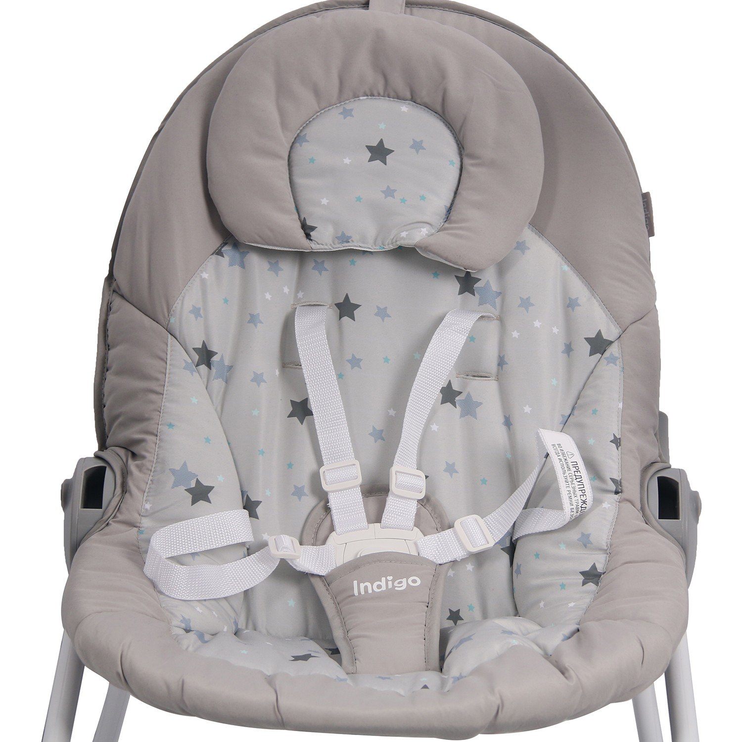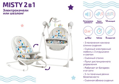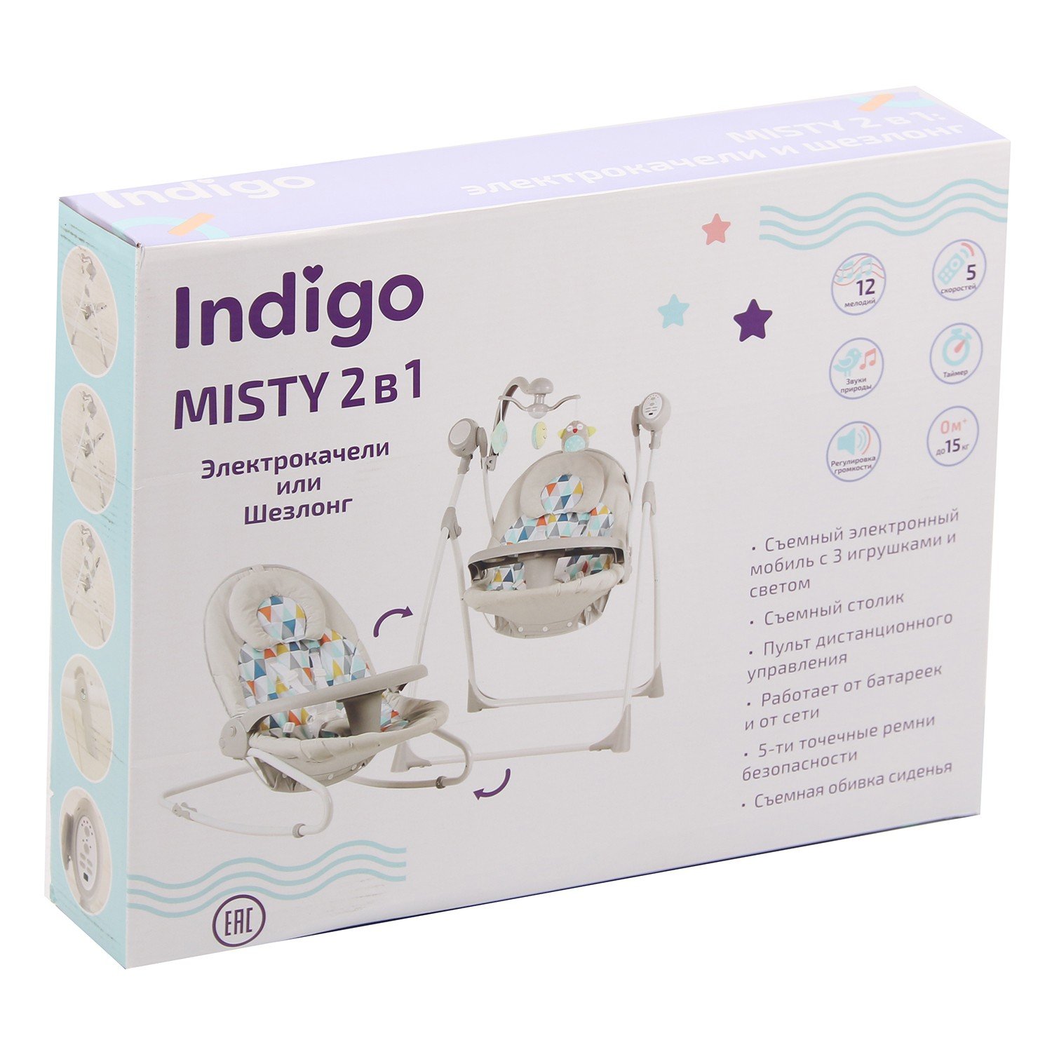 Электронные качели Indigo MISTY 2 в 1 (Индиго Мисти) - выполнены с учетом всех современных требований и ожиданий родителей. Они подходят для новорожденного малыша и могут использоваться непосредственно как электрокачели или трансформироваться в шезлонг-качалку. Качели управляются с панели или с помощью дистанционного пульта управления. Они могут работать от сети или от батареек. В Indigo MISTY предусмотрены различные скорости качания, таймер для автоматического выключения и регулировка спинки в зависимости от возраста ребенка. Для безопасности ребенка предусмотрены 5-ти точечные ремешки безопасности. Дополнительно для новорожденного предусмотрена мягкая подушечка, которая сделает пребывание в качелях более комфортным. Для развлечения ребенка предусмотрены звуки природы, мелодии, игровая дуга с игрушками и светом.