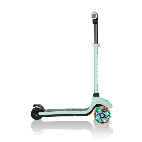 - два высококачественных и высокооткидных колеса из полиуретана диаметром 125 мм (шириной 40 мм) со светодиодной подсветкой без батареек, передние литые колеса из полиуретана мигают красным, зеленым и синим цветом (один цвет мигает в центре), а одно заднее колесо из полиуретана диаметром 90 мм (шириной 50 мм) со ступицей, установленное на подшипниках ABEC 7.