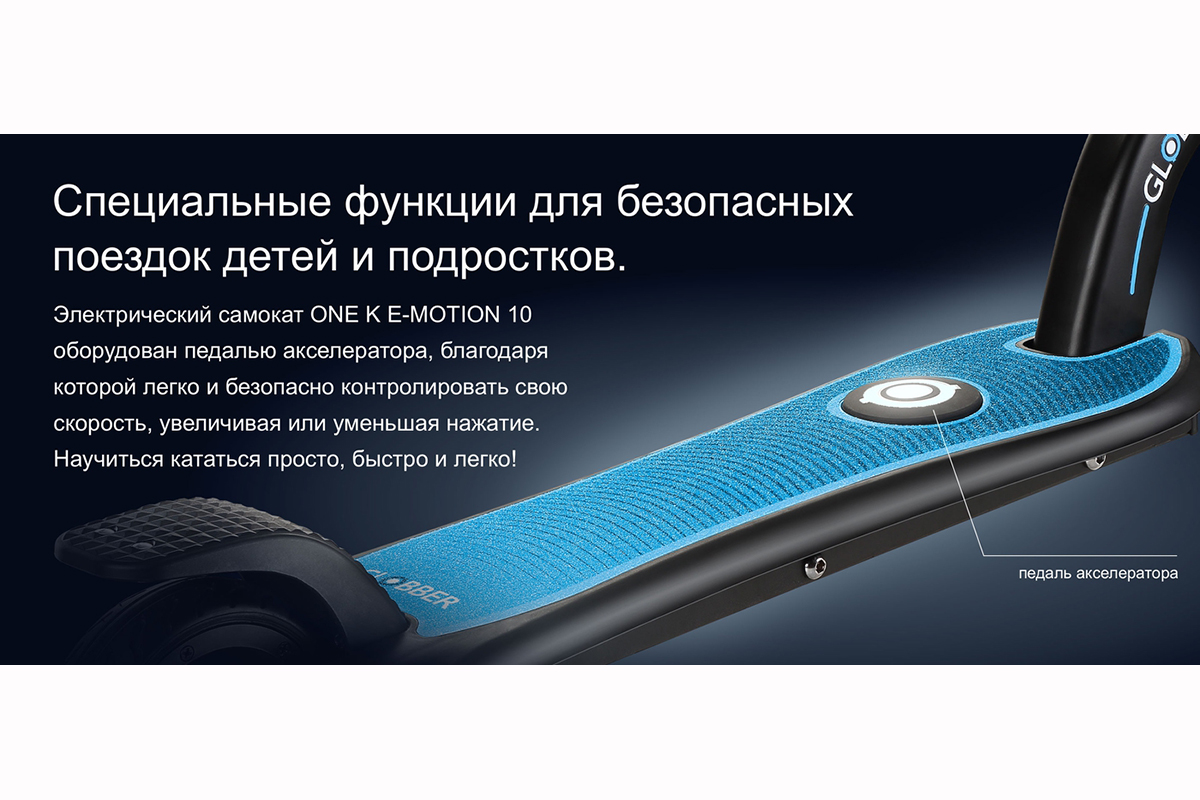 Электросамокат Globber One K E-Motion 10 (Глоббер Ван к е моушен 10 ) - электрический самокат для детей от 8 лет и подростков. Самокат отличается высоким качеством и надежностью. Самокат способен развивать скорость до 12 км в час. Чтобы ребенку было удобно управлять и контролировать скорость самоката предусмотрена удобная педаль акселератора. Кнопка включения и порт для зарядки находятся на передней части деки. Чтобы запустить мотор достаточно нажать на педаль на передней части платформы для ног. Самокат оснащен системой торможения ABS и задним механическим тормозом, что позволит сократить тормозной путь и сделать поездку на самокате более безопасной. Катание на электросамокате будет простым и удобным, а ребенок быстро разберется с транспортом.