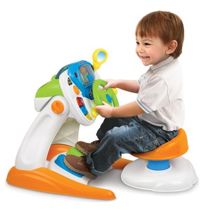 с помощью руля и коробки переключения передач ребенок управляет машинкой на экране, нажимая на разные кнопочки, слушает звуки машин и музыку.