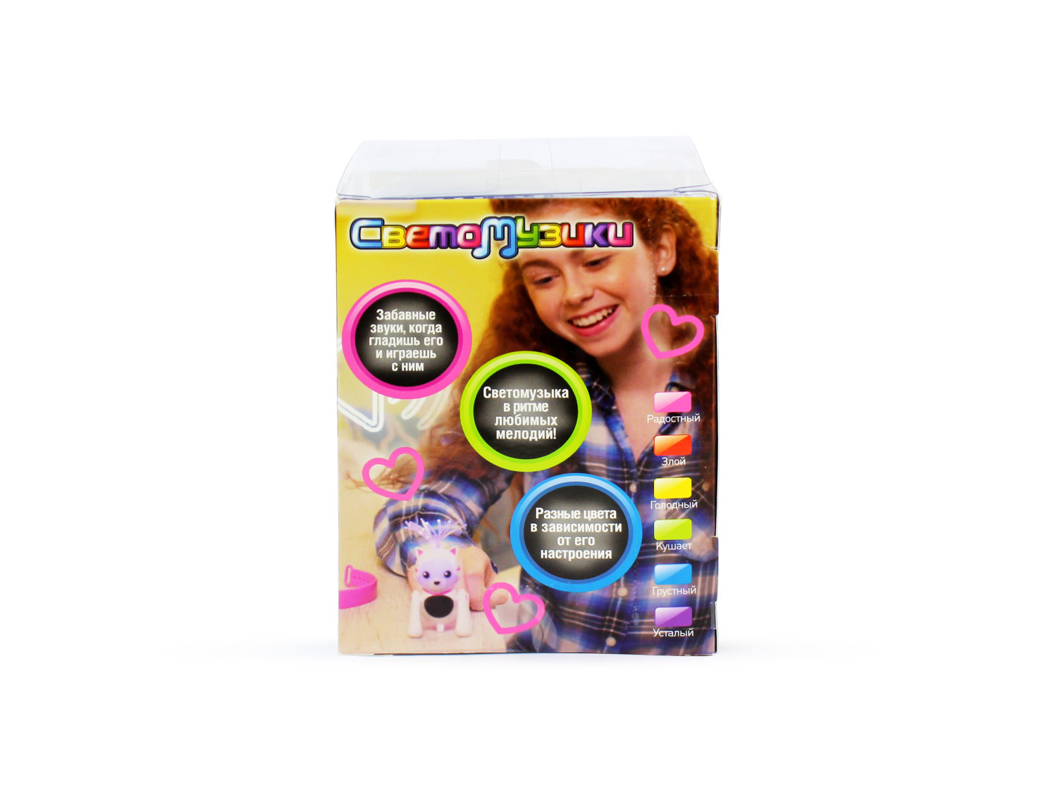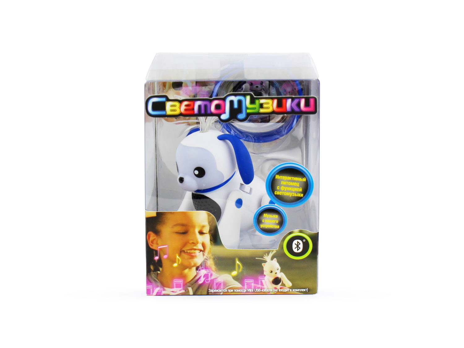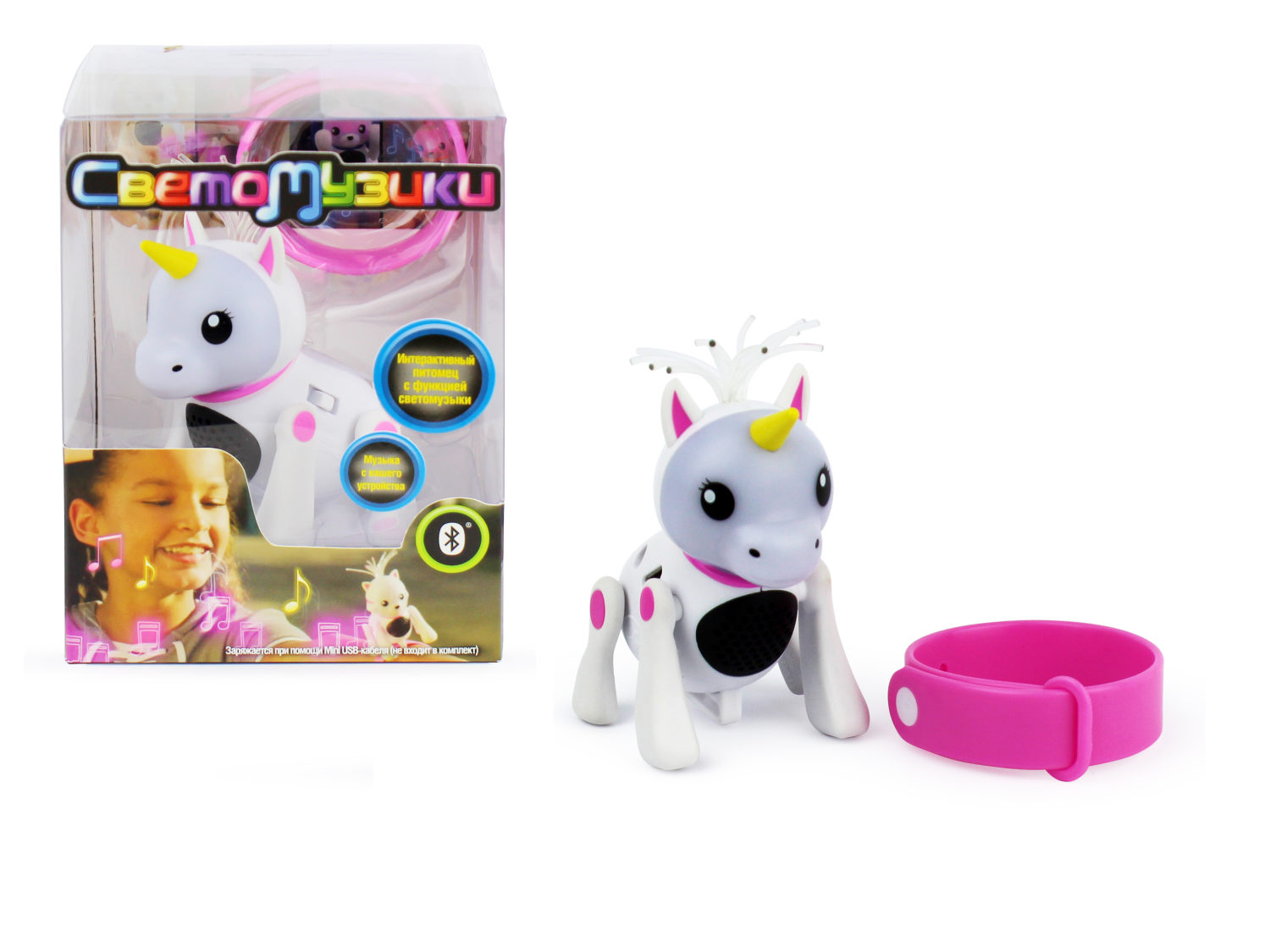 Интерактивная игрушка 1TOY Светомузики - современная игрушка для ребенка от 5 лет, с которой можно гулять, брать в путешествие, слушать музыку. Это небольшая яркая и музыкальная игрушка, которую с помощью ремешка можно закрепить на руке как часы, на рюкзак или сумку. Игрушка представлена в виде 4 питомцев: собачка, кошечка, обезьянка и единорог. Модель реагирует на прикосновения ребенка и звуки. В зависимости от настроения питомца меняется цвет его мордочки. Он издает различные звуки. Внутри питомца встроена колонка, и он может синхронизироваться по BLUETOOTH с любым мобильным устройством или компьютером. Ребенок через игрушку будет слушать музыку, а игрушка подсвечиваться в такт ( мордочка пульсирует под музыку, хвостик и пучок светятся).