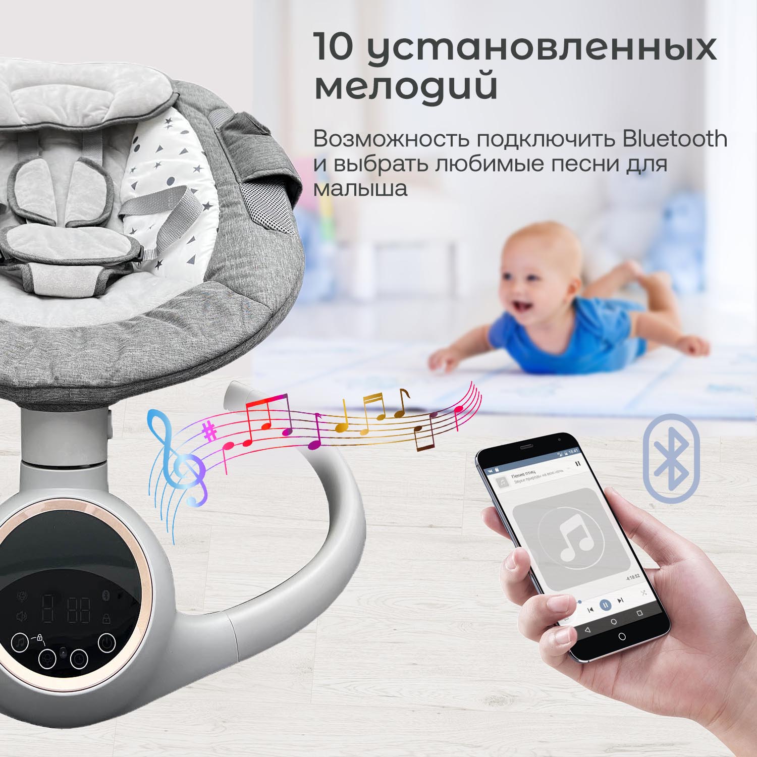 Выбирайте интенсивность и варианты качания из 5 вариантов, наблюдая за реакцией малыша. Можно выбрать любую из 10 мелодий, либо подключить ваш плейлист из телефона при помощи Bluetooth. Качели имеют 2 положения наклона. Для комфорта малыша продумана система пятиточечных ремней с накладками и небольшой мягкий подголовник. Обязательно пристегивайте ребенка, когда используете качели и не оставляйте малыша без присмотра.