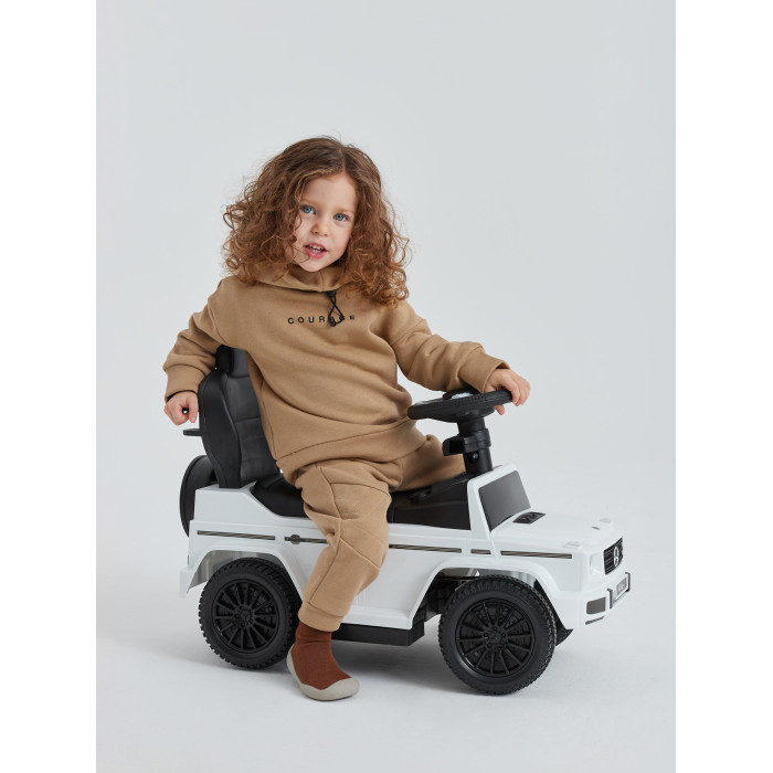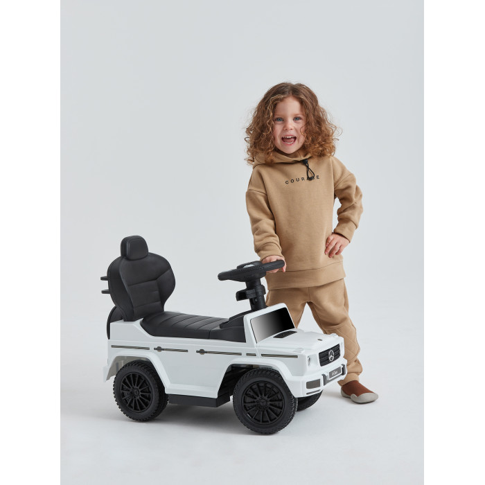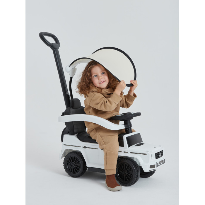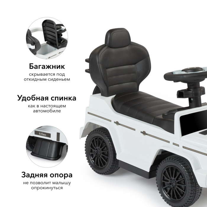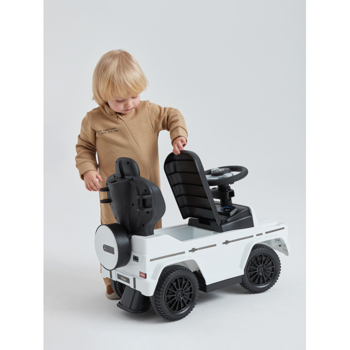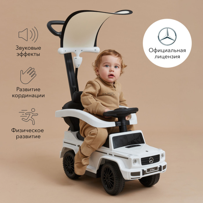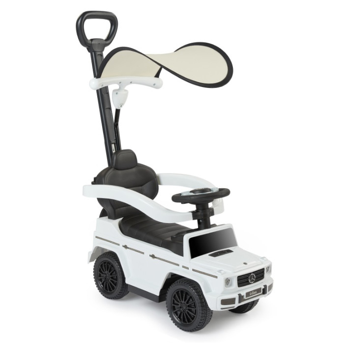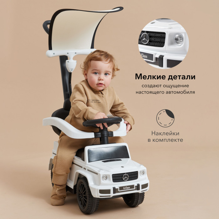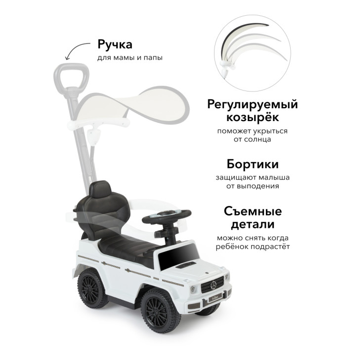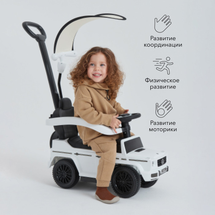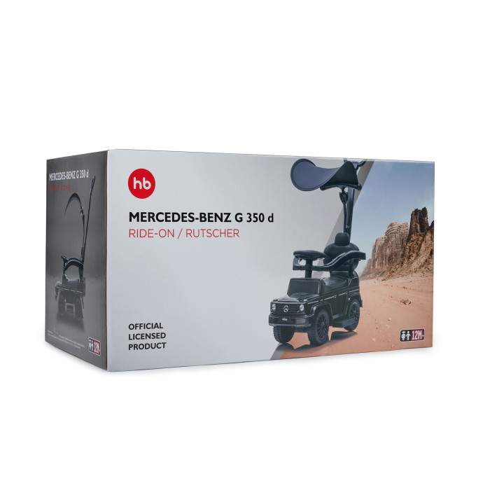 Каталка Happy Baby Mercedes Benz G350d 50010 (Хэппи беби) - стильная и современная машина в виде настоящего внедорожника Mercedes Benz. Большая комплектация машины обязательно понравится ребенку. Все нажимается, открывается, крутиться. Есть звуковые эффекты, чтобы ребенку было максимально интересно за рулем. Такую машинку можно смело использовать не только дома, но и на улице. Для защиты от небольших осадков или солнышка предусмотрен съемный козырек. Машинка предназначена для ребенка от 1 годика, а для безопасности крохи предусмотрен задний стопор от опрокидывания и специальные бортики - ограничители, которые легко снимаются, когда ребенок подрастет. Машинка едет с помощью отталкивающих движений ребенка или с помощью родителей. Каталка способствует физическому и эмоциональному развитию ребенка, развитию координации движений, моторики и пространственного восприятия.