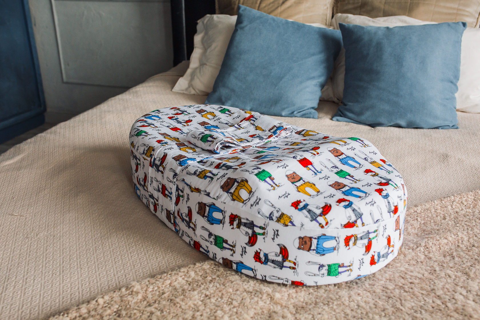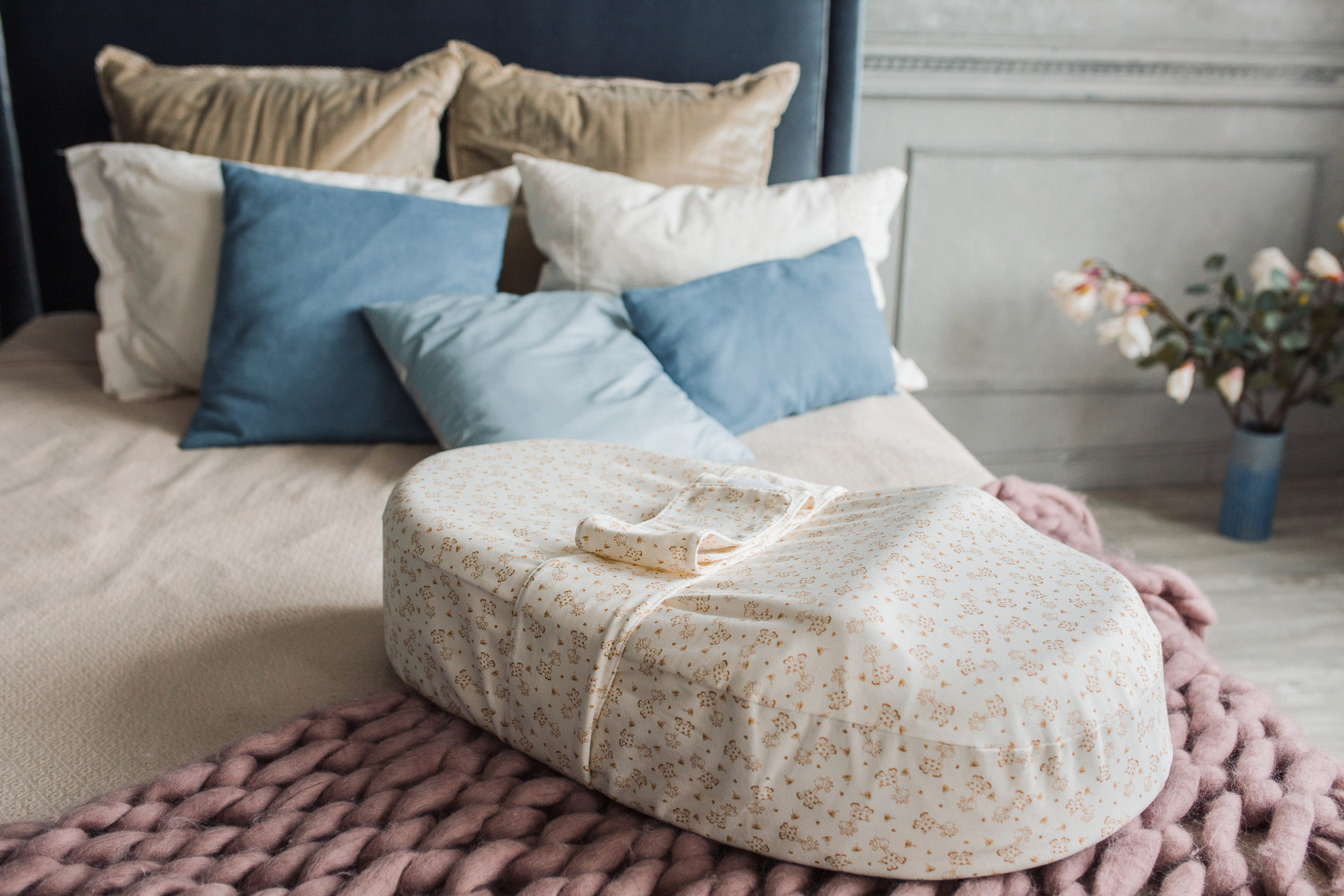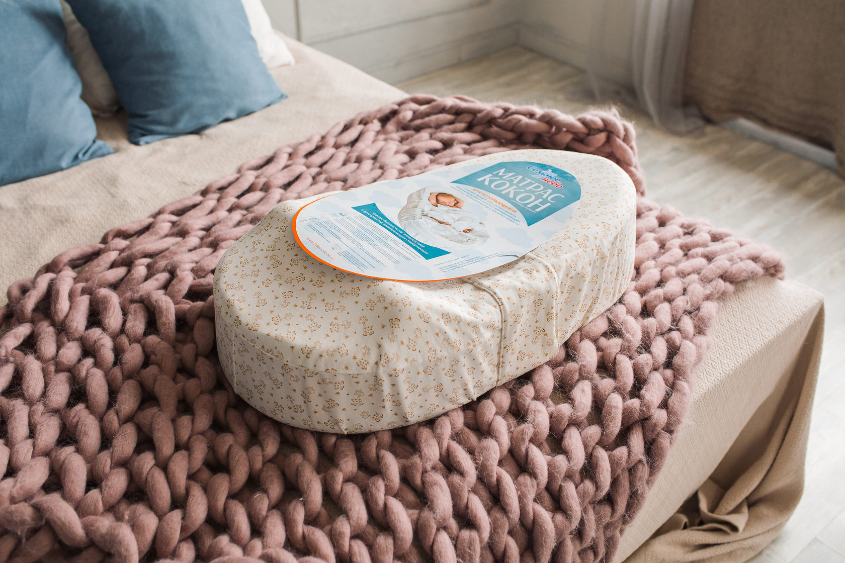 В комплекте: кокон, три чехла: нижний непромокаемый с валиком и верхний из супер-мягкого капитония и футера с поясом, дополнительный сменный чехол из кулирки, пояс ограничитель, регулируемый валик, пеленка из муслина в подарок. Упакован матрас в сумку -переноску.
