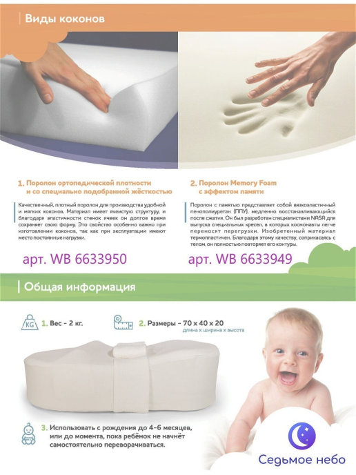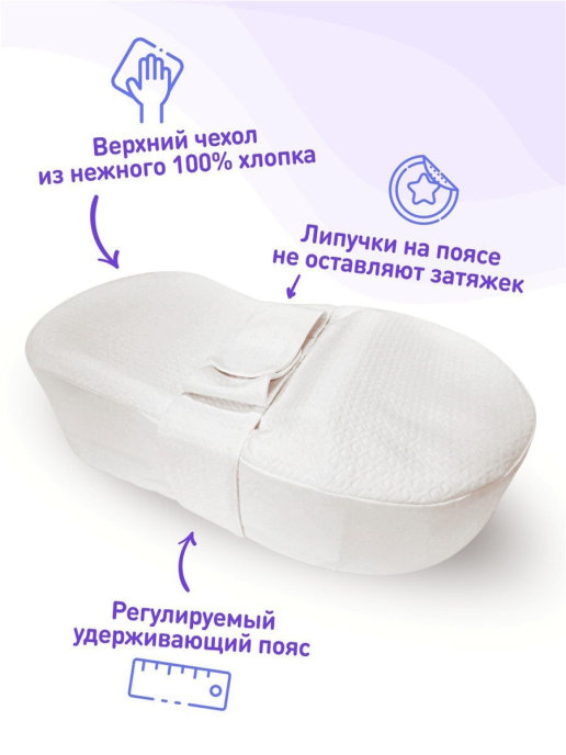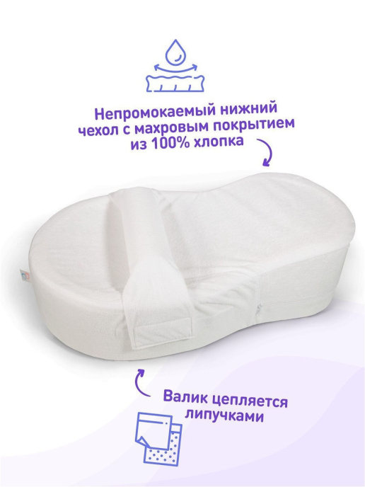 Кокон подходит для использования с детьми весом от 2,8 до 9 кг, в возрасте до 4-6 месяцев, либо до того момента, когда ребенок начнет самостоятельно переворачиваться, в зависимости от того, что наступит раньше. Кокон оборудован специальным валиком, который легко перемещается и фиксируется липучками, что позволяет легко регулировать размер кокона по мере роста ребенка, валик можно полностью убрать, если он больше не нужен. - Материал: поролон ортопедической плотности и со специально подобранной жесткостью. - Нижний чехол: мембранная ткань с поверхностью из 100% хлопка. Ткань полностью исключает сквозное промокание. - Верхний чехол: декоративный чехол из 100% хлопкового трикотажа. - Валик под ножки: перемещаемый валик на липучках для регулирования размера кокона с ростом малыша. - Пояс безопасности: регулируемый пояс в цвет верхнего чехла.