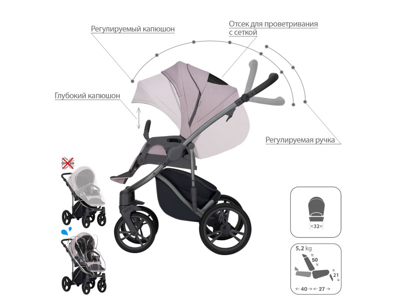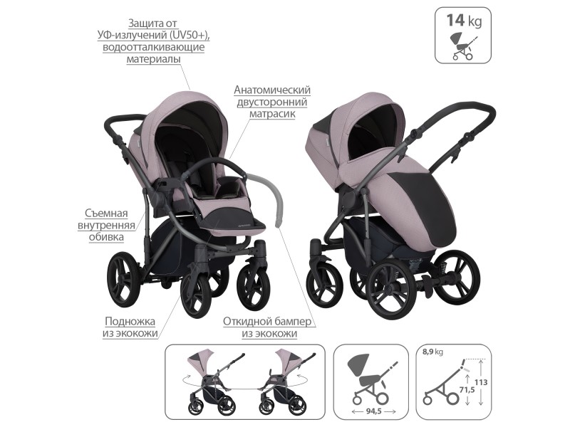 - Обивка коляски: водоотталкивающая, съемная, с УФ-защитой 50+.
